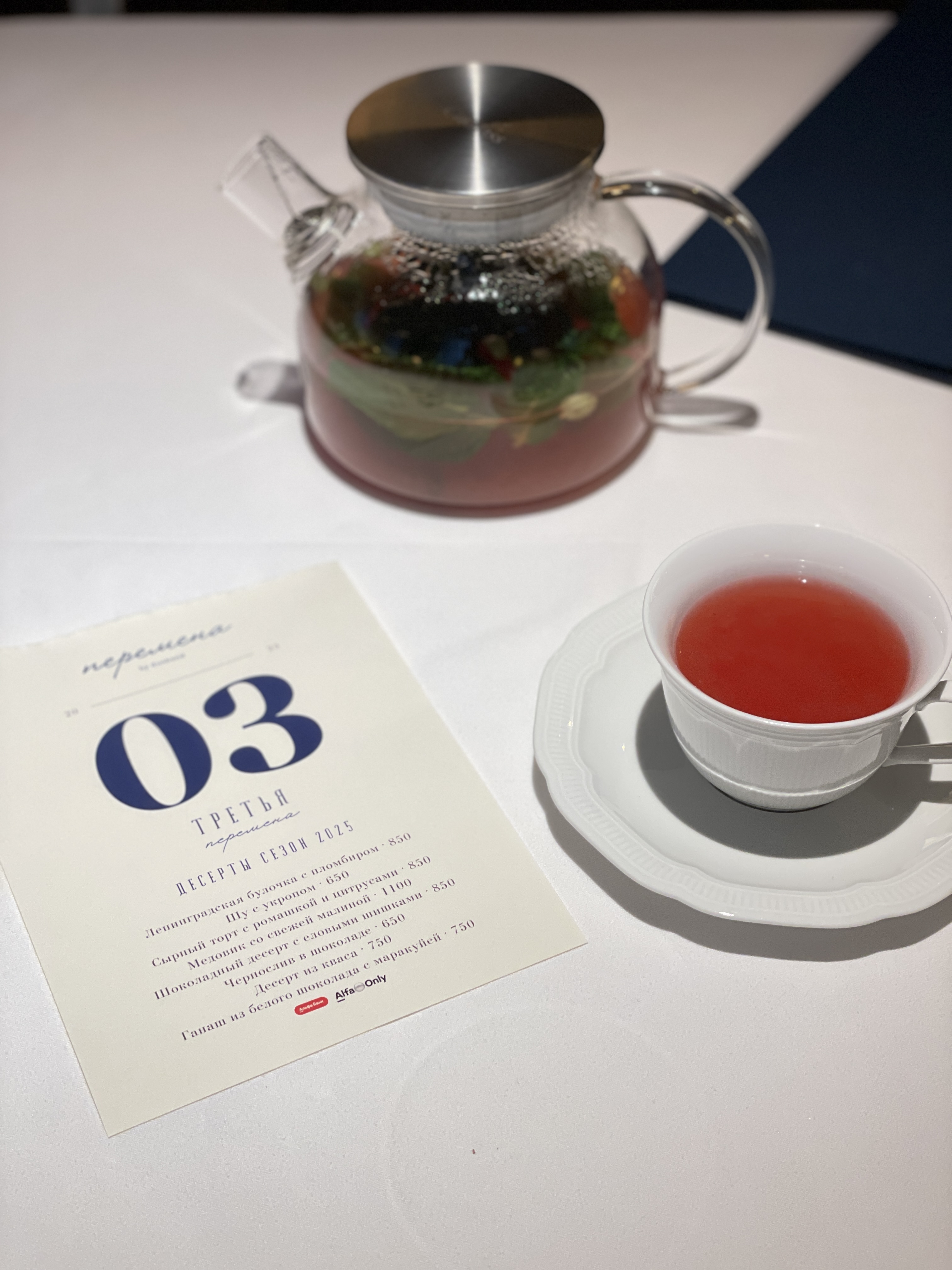 Меню само по себе тоже необычное — большое, в нем первая и вторая перемена, а третья перемена — десерты, соответственно, меню — подается отрывным листком календаря, на котором стоит 3 число))) "Я календарь переверну и снова 3…".