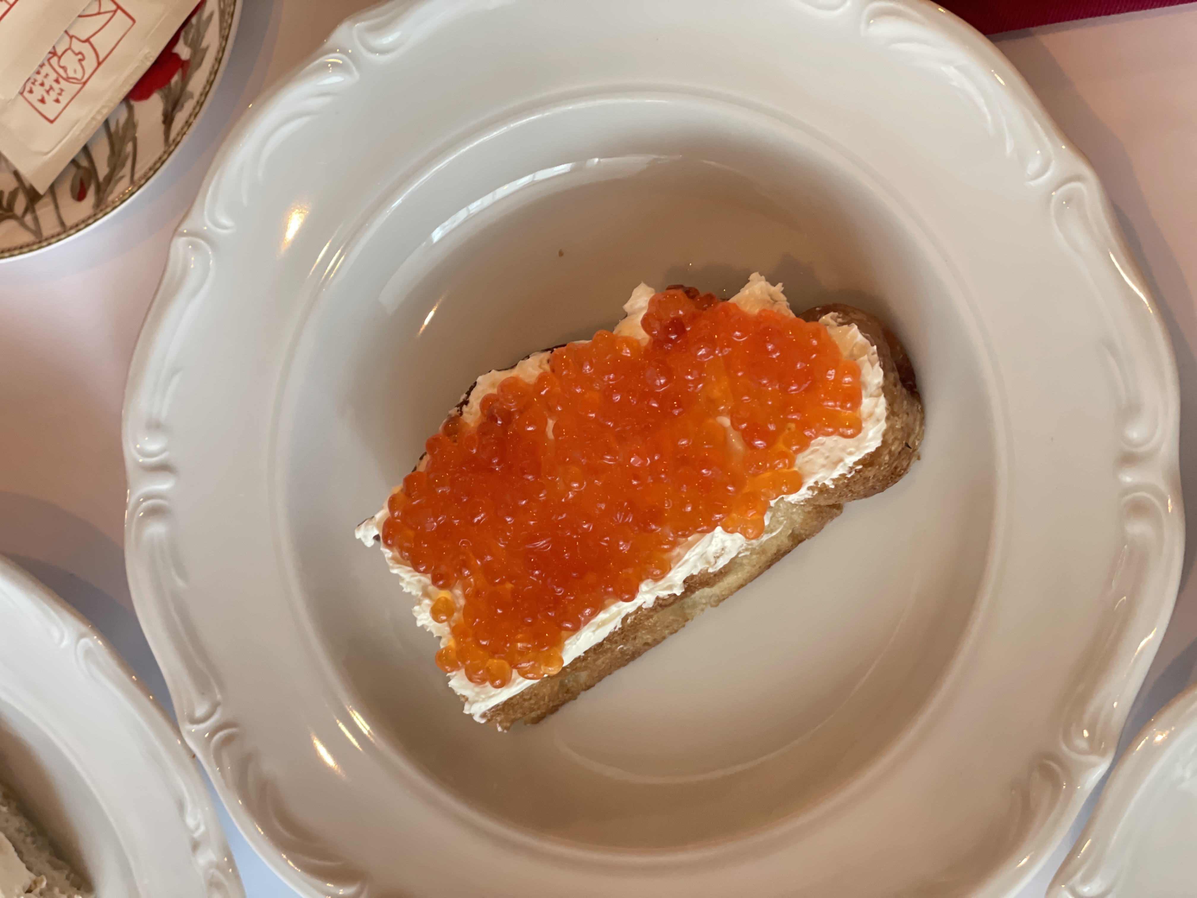 Мы заказали 2 бутерброда с красной икрой: мягкое взбитое масло на бриош с вкусной свежей икрой, правда я до сих пор не научилась различать по вкусу икры, какой рыбе она принадлежала)