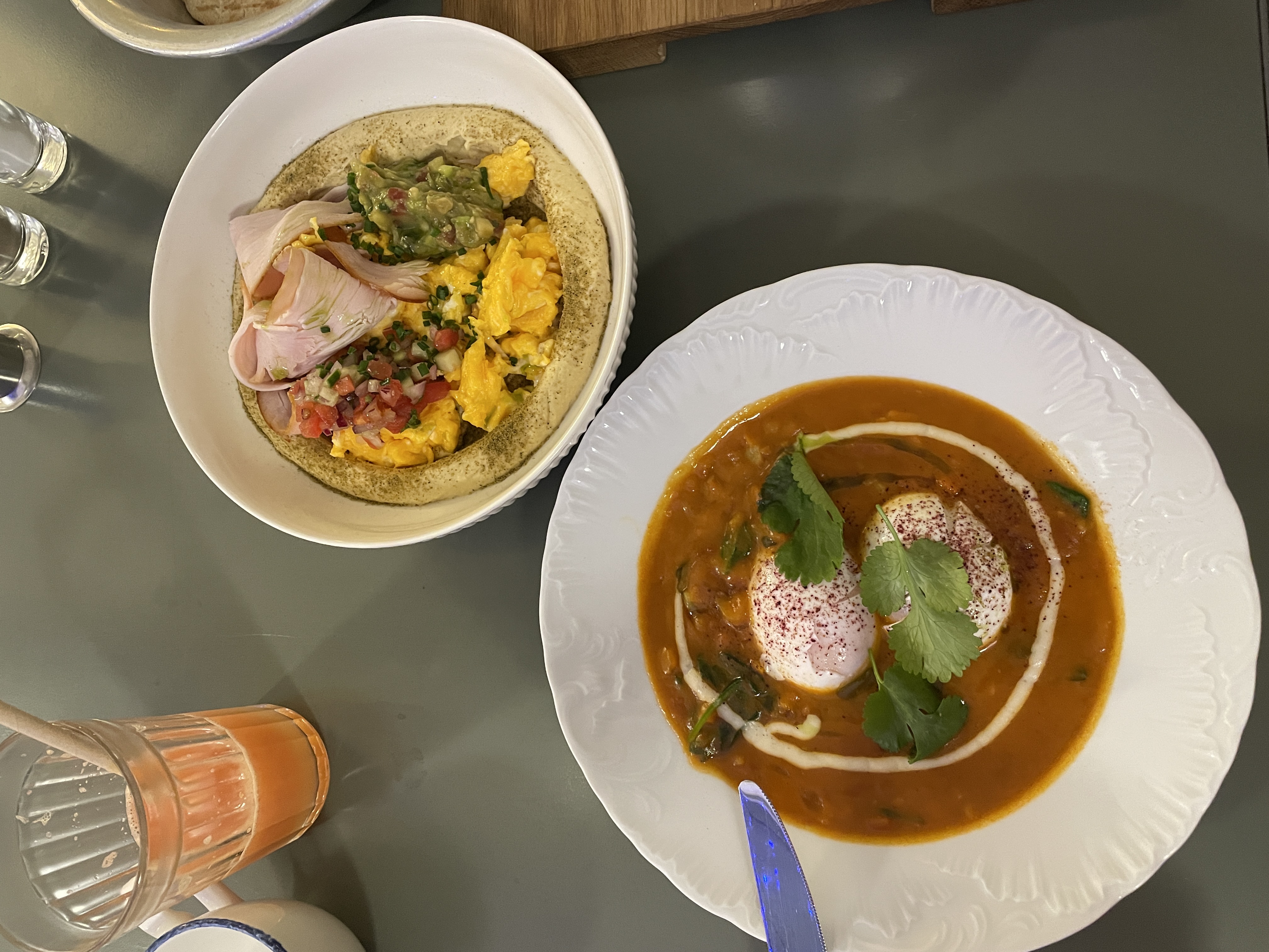 Подруга заказала хумус со скремблом с гуакамоле и говядиной. Отдельно подается горячая лепешка. Я бы назвала это блюда мужским, потому что больше порция и невероятно сытно.