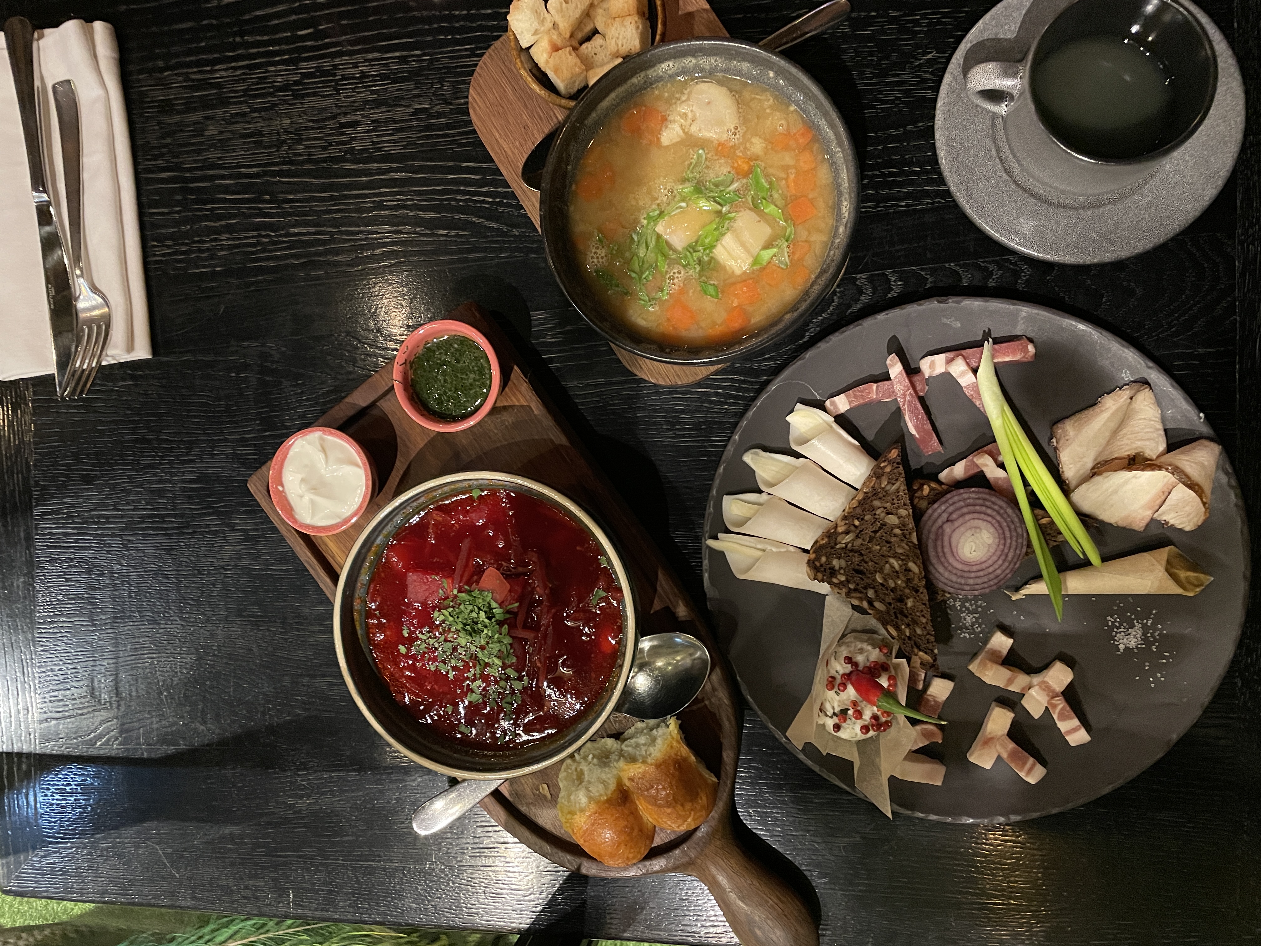 Улыбающиеся девицы и хлопцы встречают и радостно принимают заказ. Мы ели ассорти сала, которое подаётся на большой тарелке. Смалец, соленое и копченое сало (ооочень нежное), подчеревок (это часть брюшной области, где много мяса) и еще одно очень необычное томленое в меду и травах. Как оказалось, на вкус и цвет, каждому понравилось больше свое из ассорти. Хотя в этом ресторане даже смалец был вкусный, обычно я к нему равнодушна.