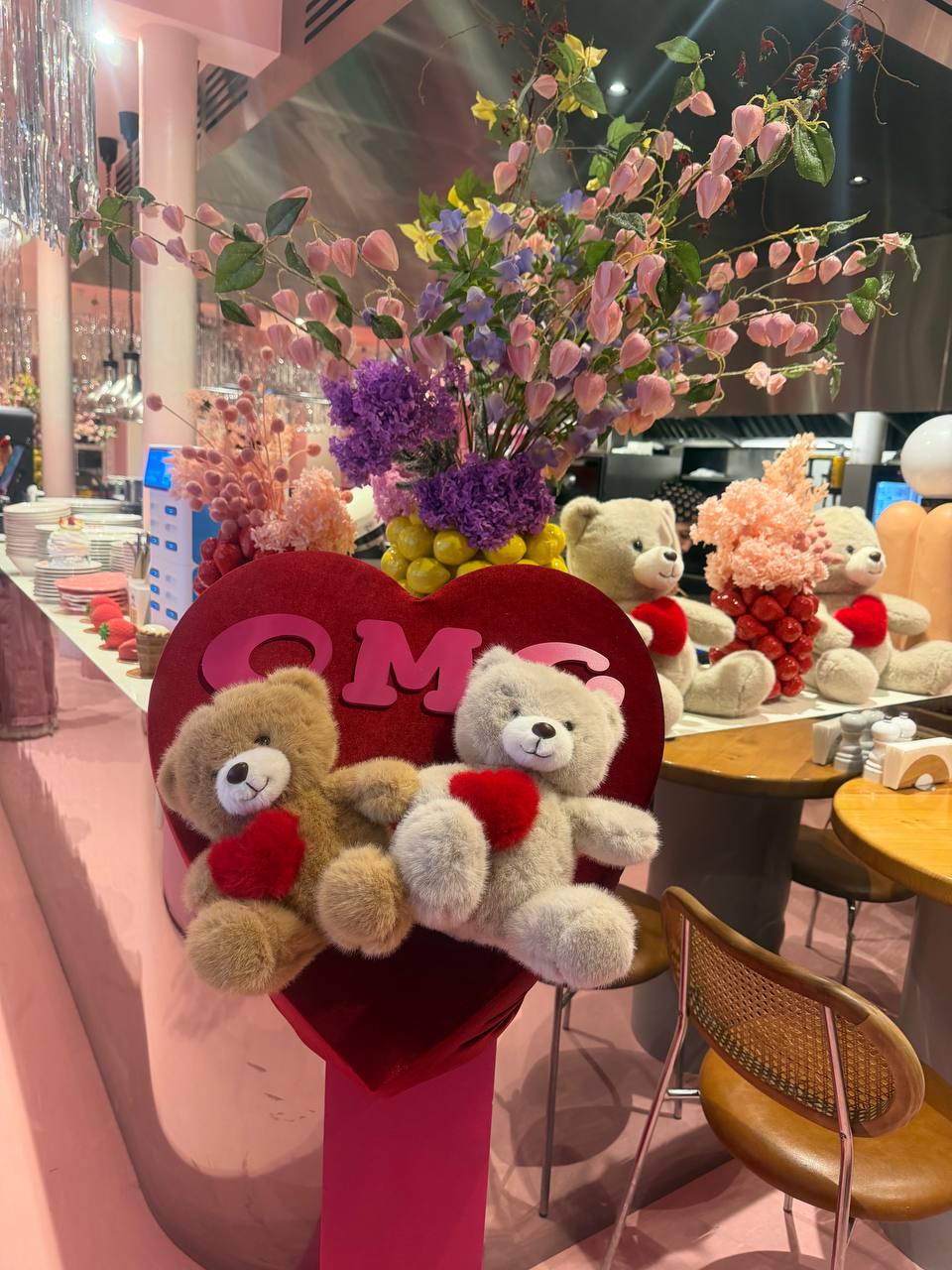 Есть витрина с десертами, которые тоже придумывают в зависимости от праздников. Например, на Новый год был популярен Гринч, а ко дню всех влюблённых предлагают выбрать Поцелуй, Мишку или сердечки.