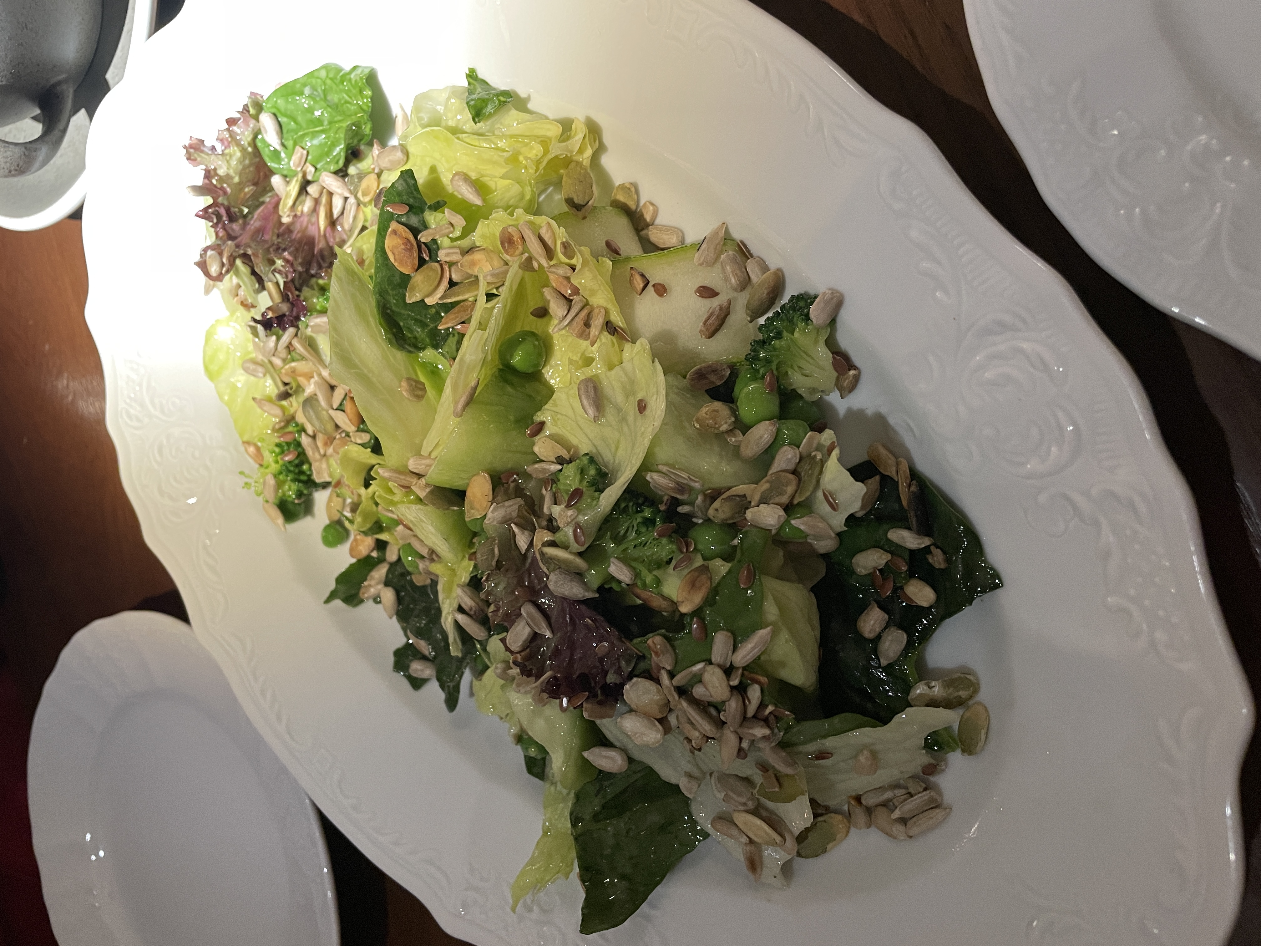 Конечно был зеленый салат, правда без гречки, просто с цукини, шпинатом, различными семенами, огурцами и брокколи.