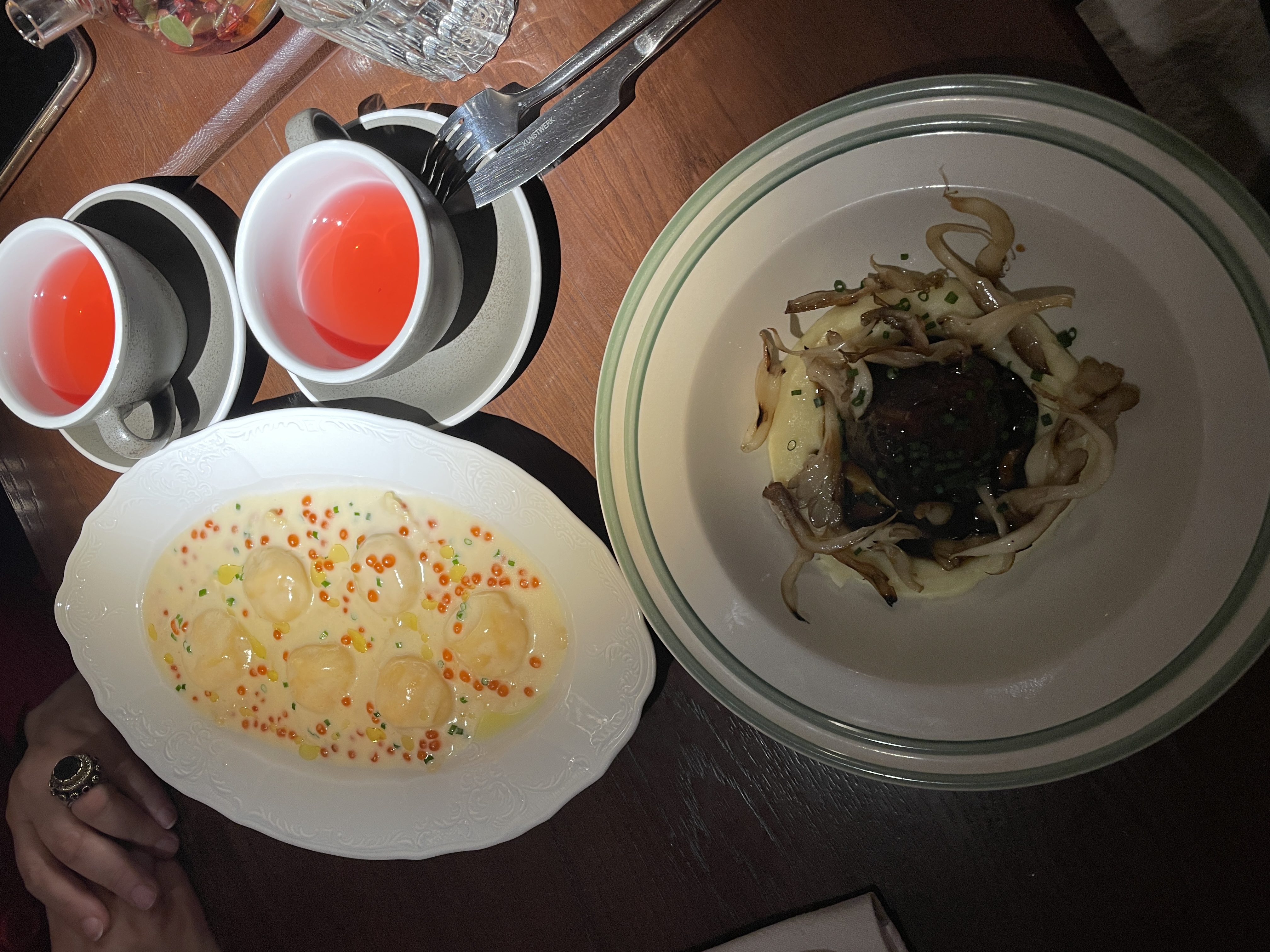 На горячее ела щечки с пюре со сладким соусом и грибами, которые почему-то приняла за кальмаров. Хотя конечно понимала, что говяжьи щечки и кальмар — странное сочетание)