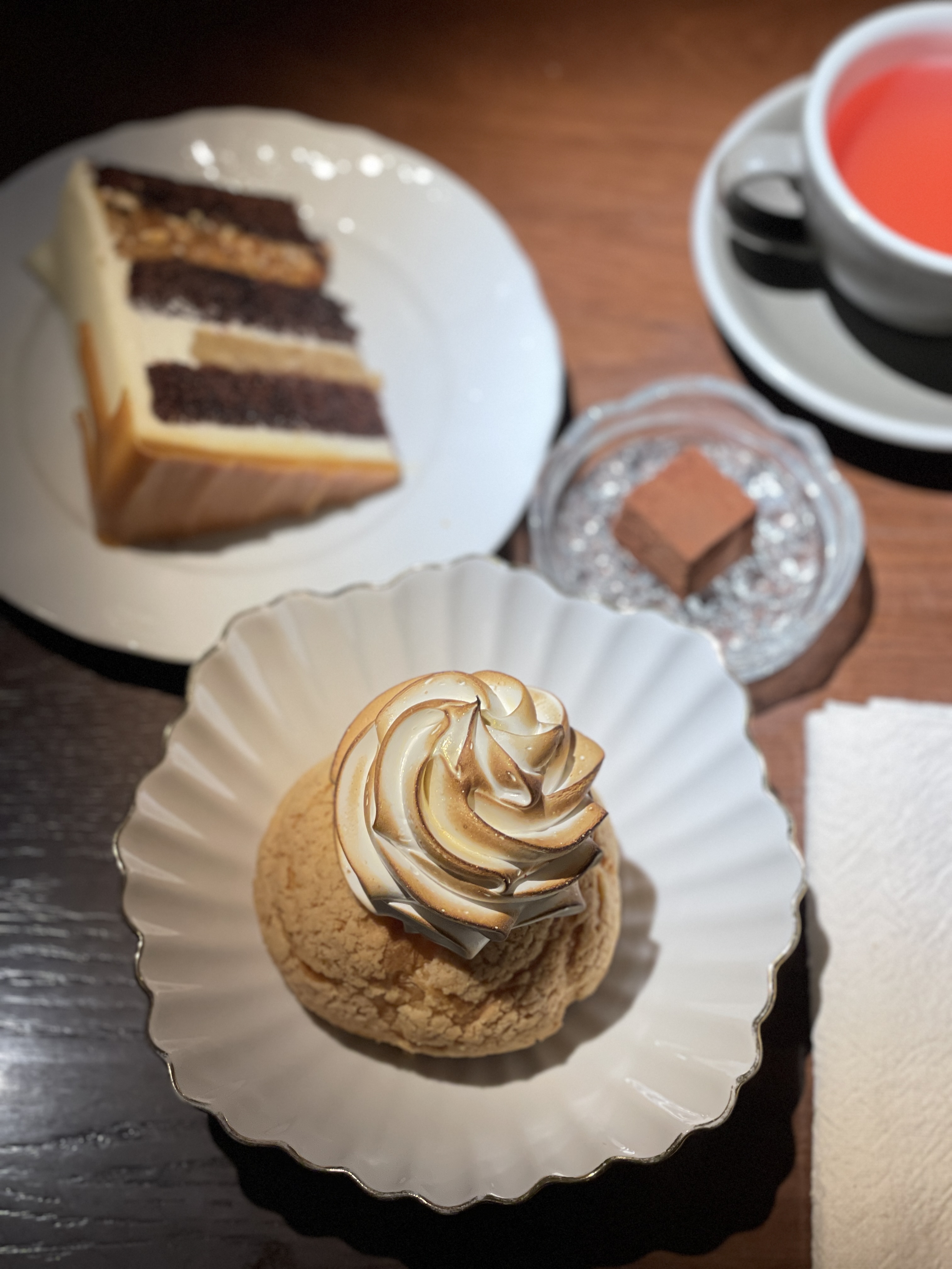 И да, без десерта не обошлось: Анаит попробовала кусочек (хотя это скорее кусочище) карамельно-бананового торта, а я с удовольствием съела Шу с лимоном: нежнейший кисленький десерт, хотя тоже большой) и какао с чили — прекрасная компания для воскресного вечера. Столько теплых воспоминаний и встреч было в этом ресторане.