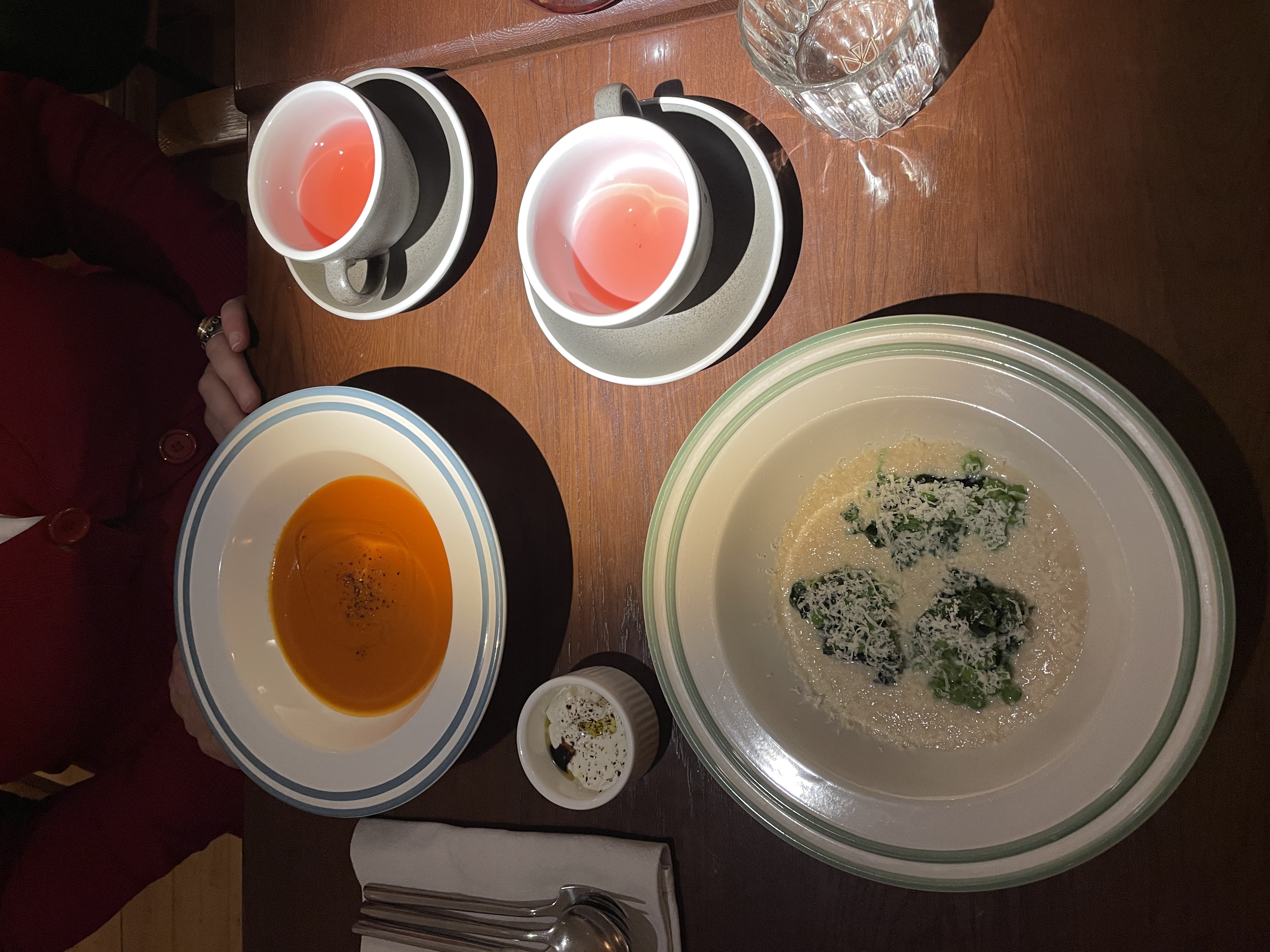 Ели супы: томатный со страчателлой и суп-пюре из цветной капусты с зеленым горошком, шпинатом и пармезаном. Текстура нежнейшая, сыр придает пикантность и тягучесть.
