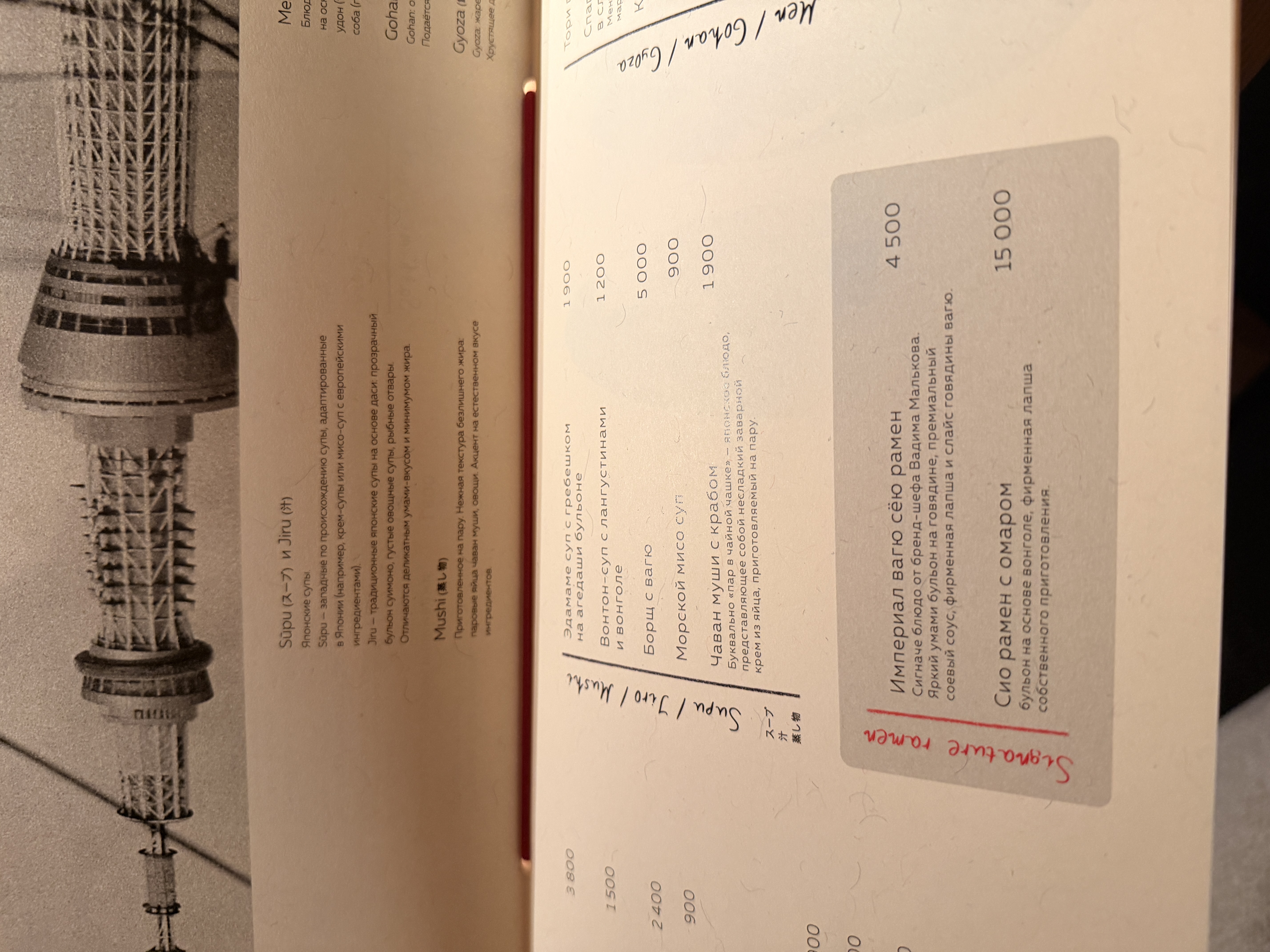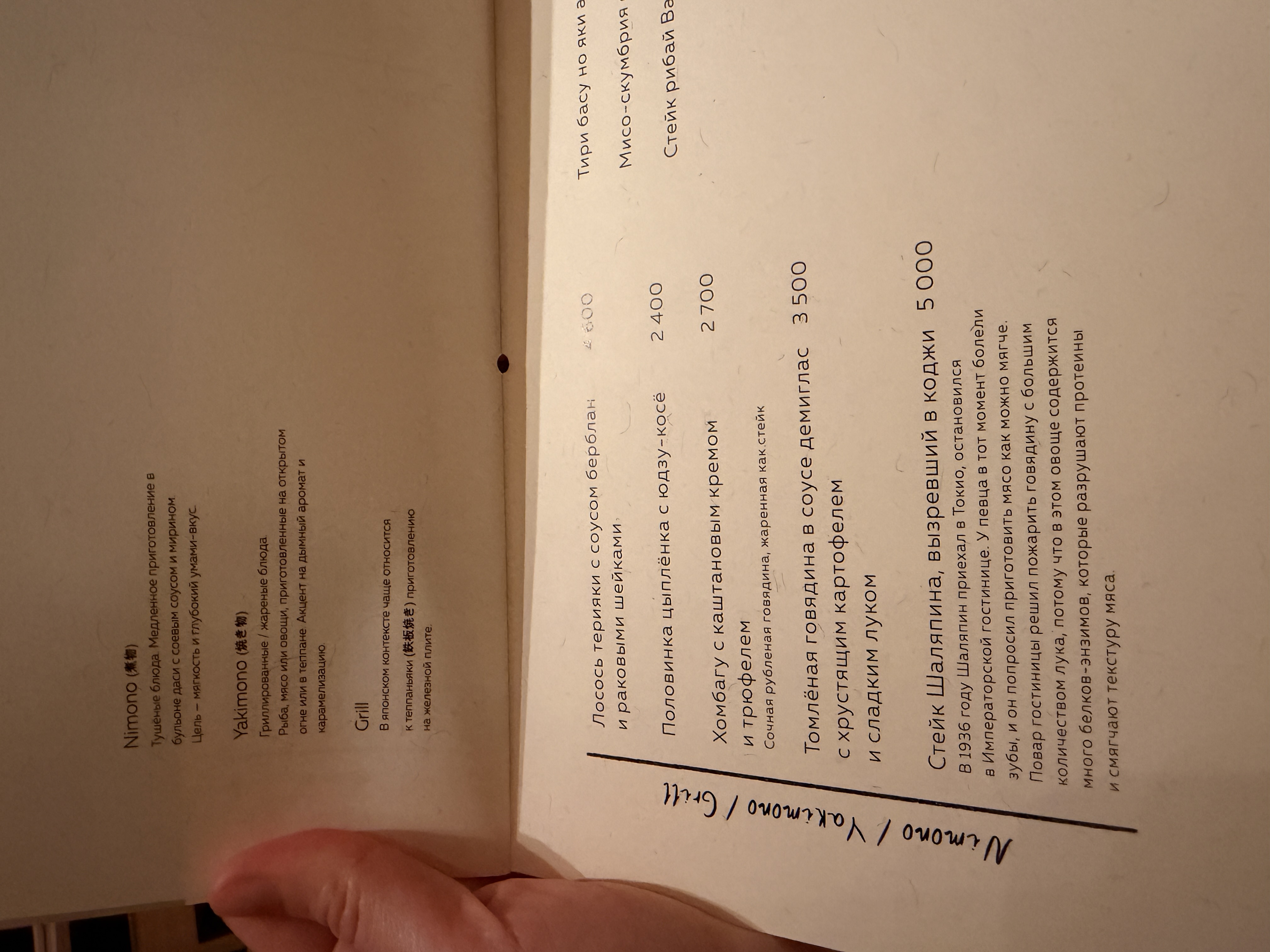 Мы были в ресторане небольшой компанией, поэтому попробовали несколько разных блюд. Правильные названия буду выписывать из меню, которое я сфотографировала, потому что с японской кухней знакомство начала лишь недавно. Кстати, меню заслуживает отдельного внимания, потому что оно неклассической формы: длинное и горизонтальное на светлой бумаге и открывается вверх, как книга. Здорово, что есть описания к блюдам, потому что вероятно некоторые гости, как и я, не знакомы с японскими названиями блюд.