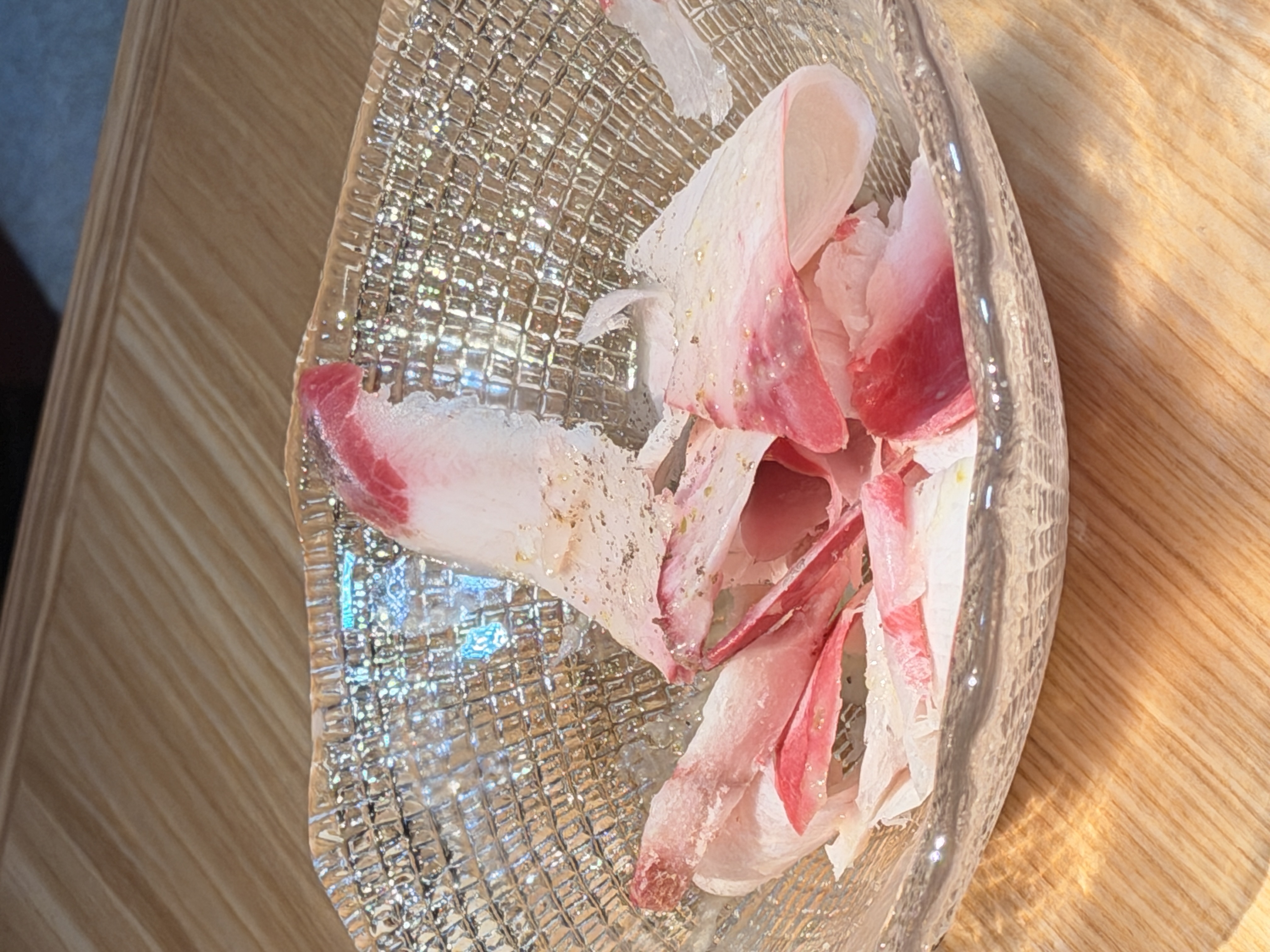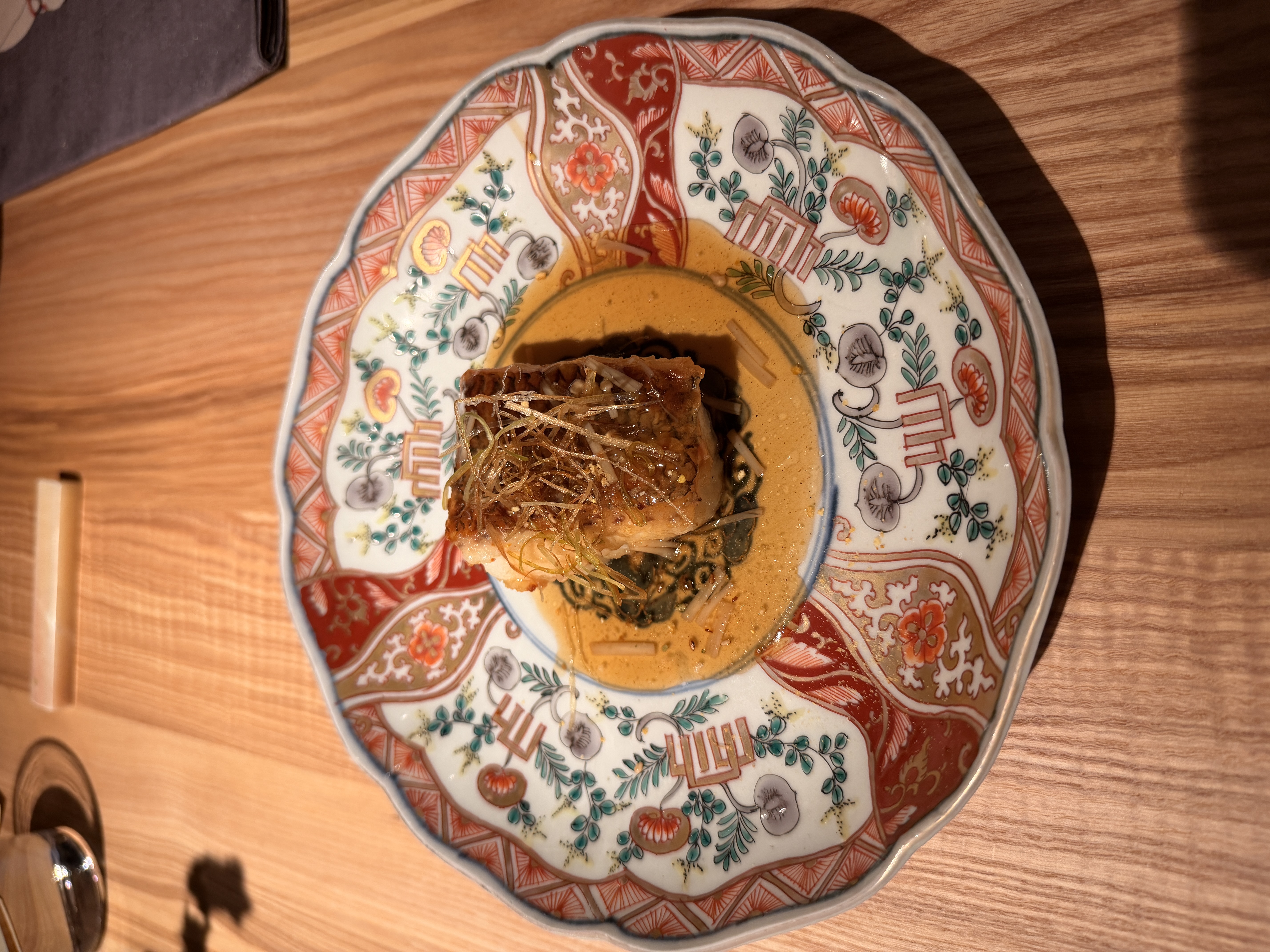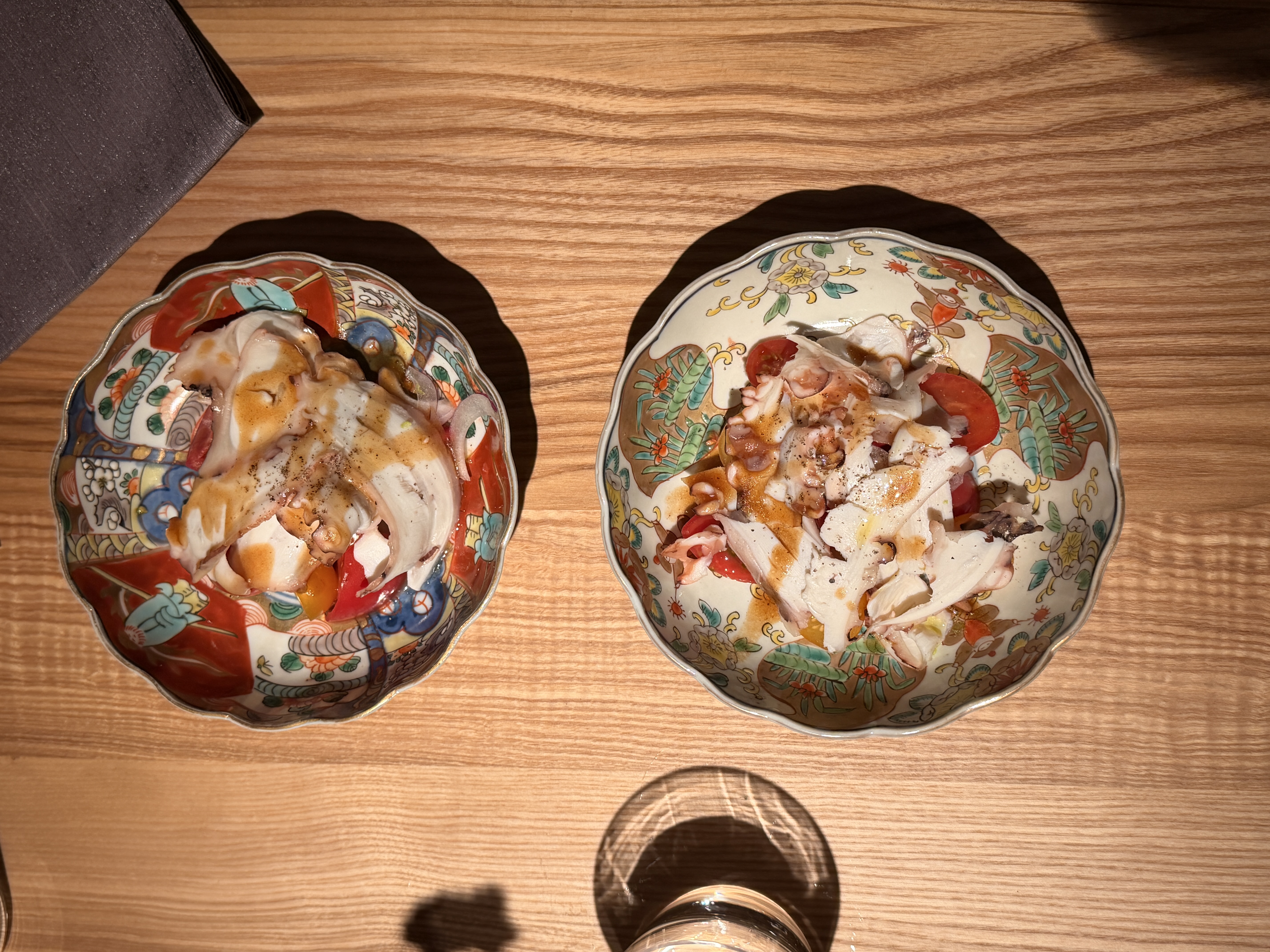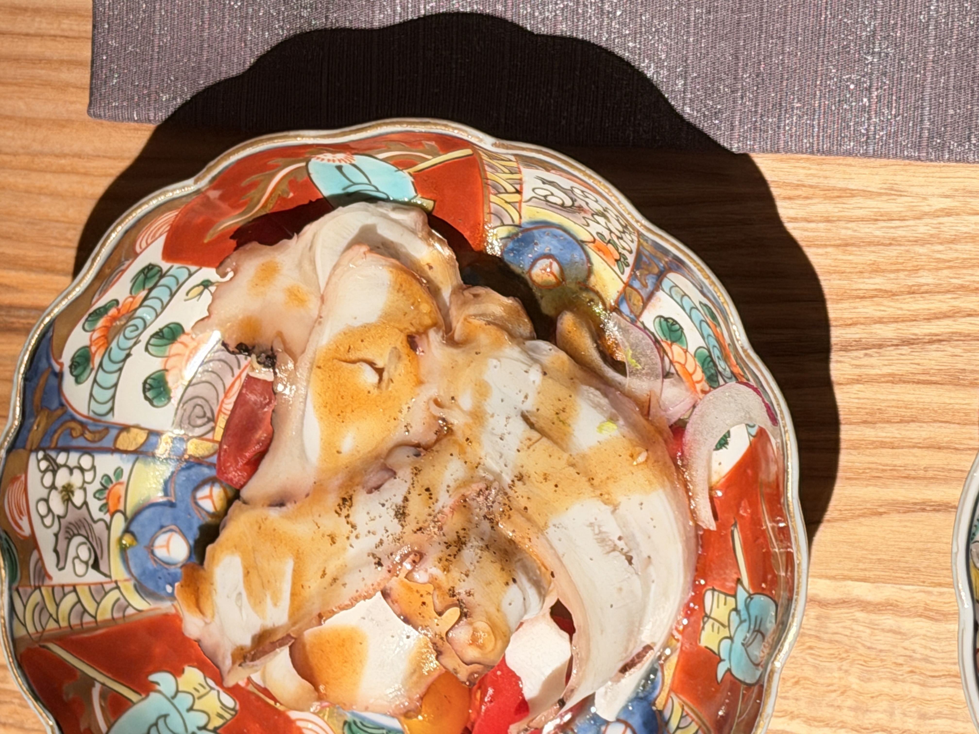 Конечно, меня очаровал осьминог с тонкацу-трюфельной заправкой, нарезанный слайсами, который был подан в глубокой расписной японской тарелке вместе с помидорами.
