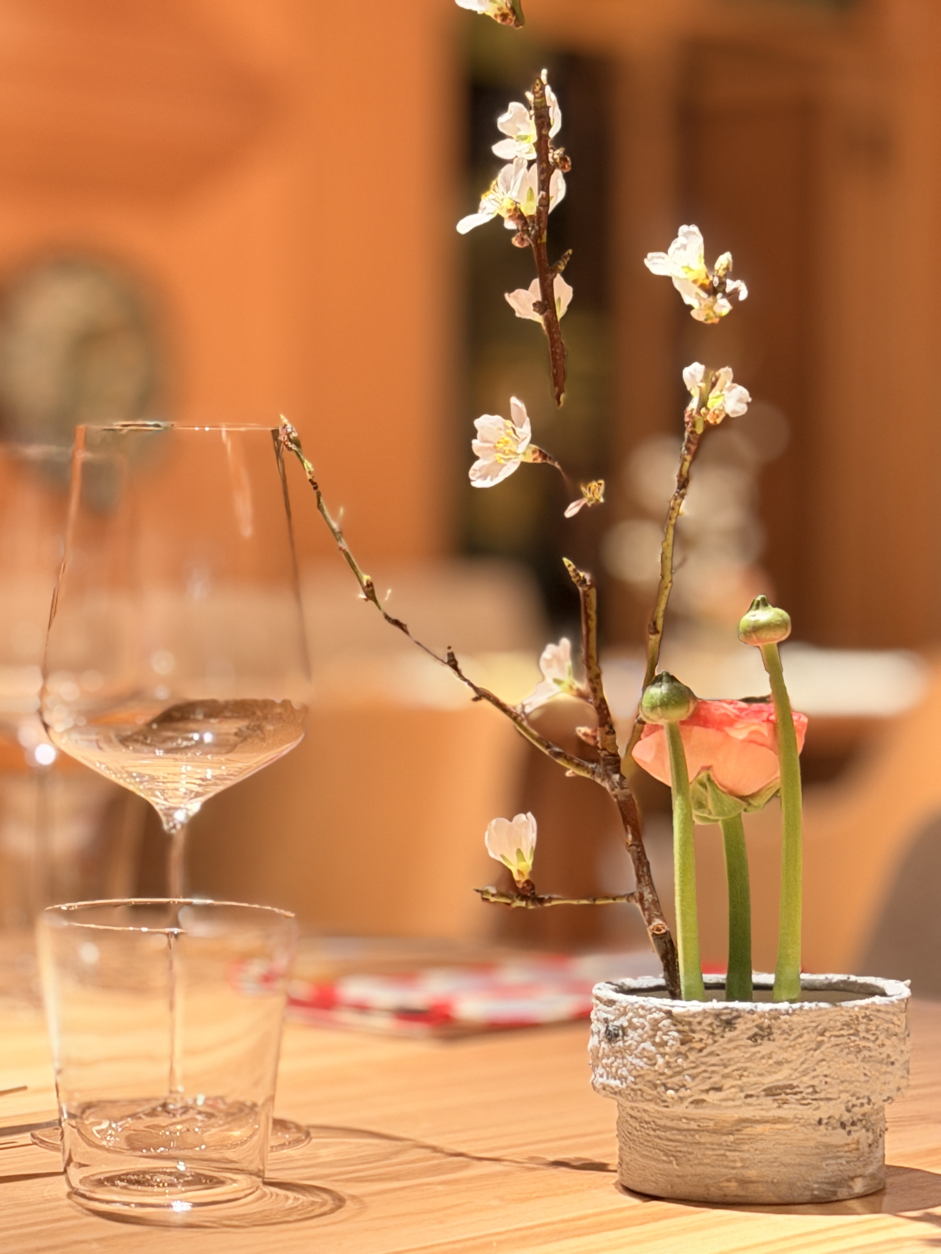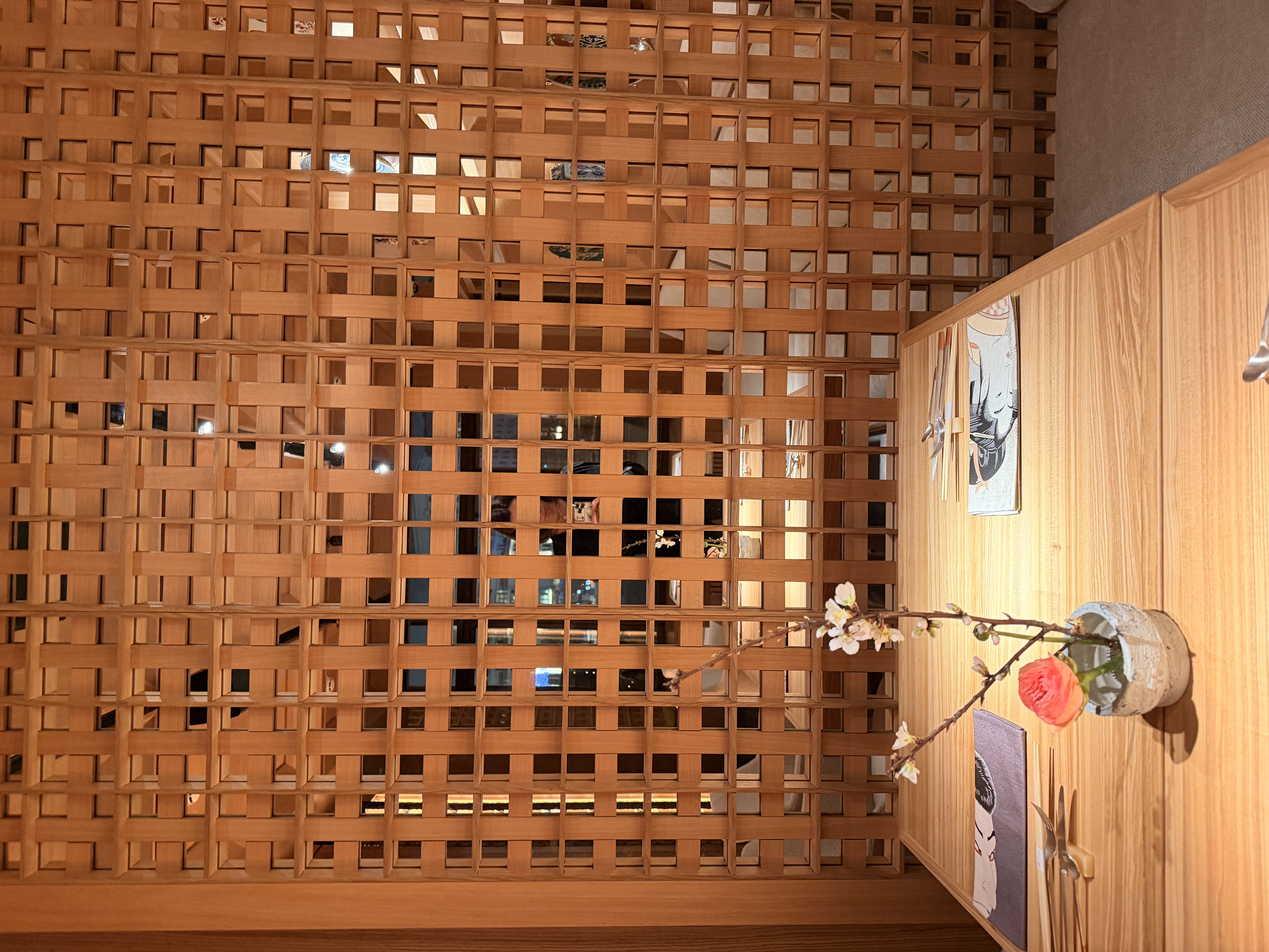 Интерьер выполнен в светлых тонах, где преобладает дерево и большие настенные панно. Отметила для себя удивительно стильные приборы и салфетки — у каждого гостя они уникальные. Понравились живые композиции с сакурой на столах.