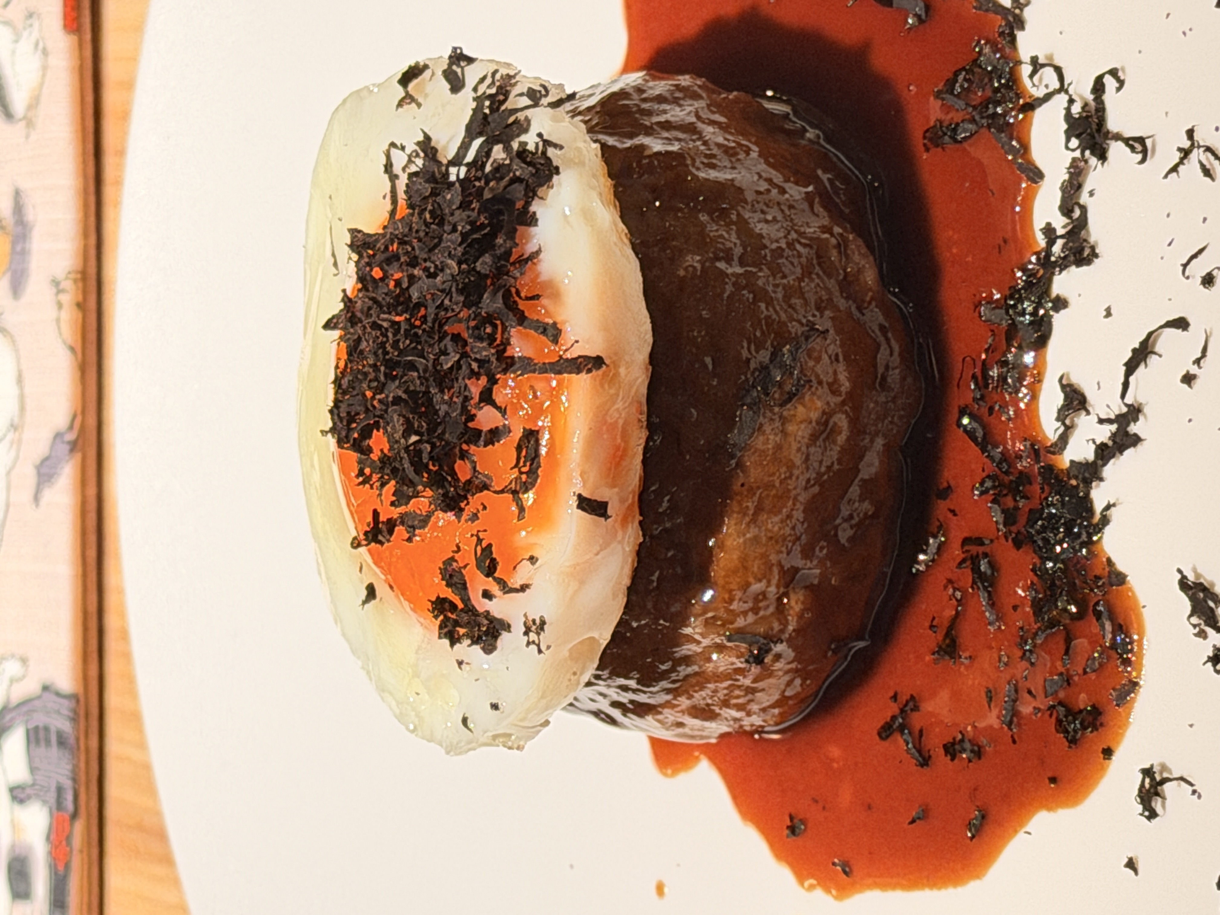 Хамбагу с шимеджи и трюфелем — котлета из рубленого мяса, которая готовится как стейк, с жареным яйцом сверху в фантастическом соусе, придающем блюду изысканность. Сочно, насыщенно и сытно.