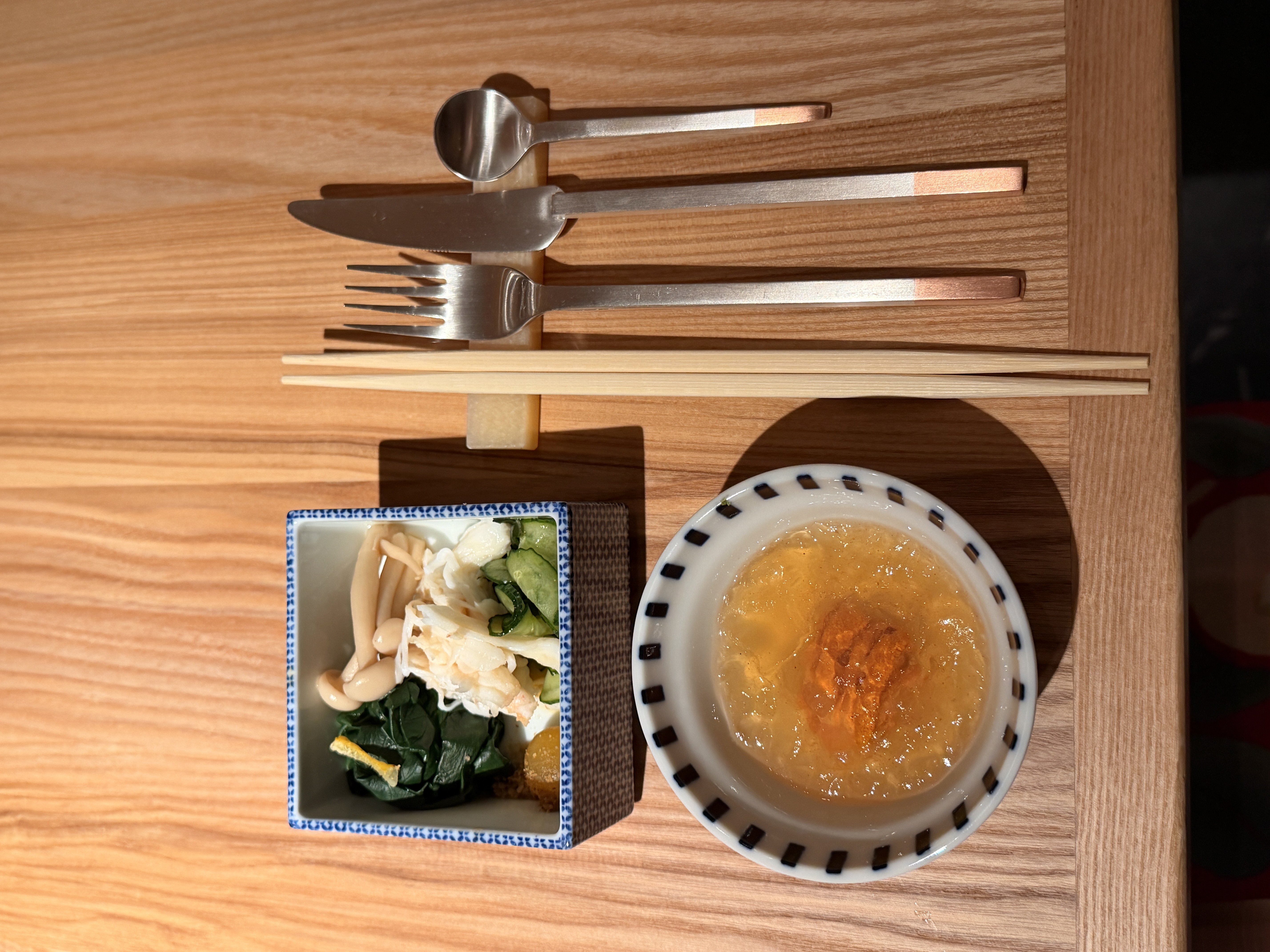 Вторая закуска: охиташи с крабом и шимеджи (огурцы, зелень, грибы и крабовое мясо).