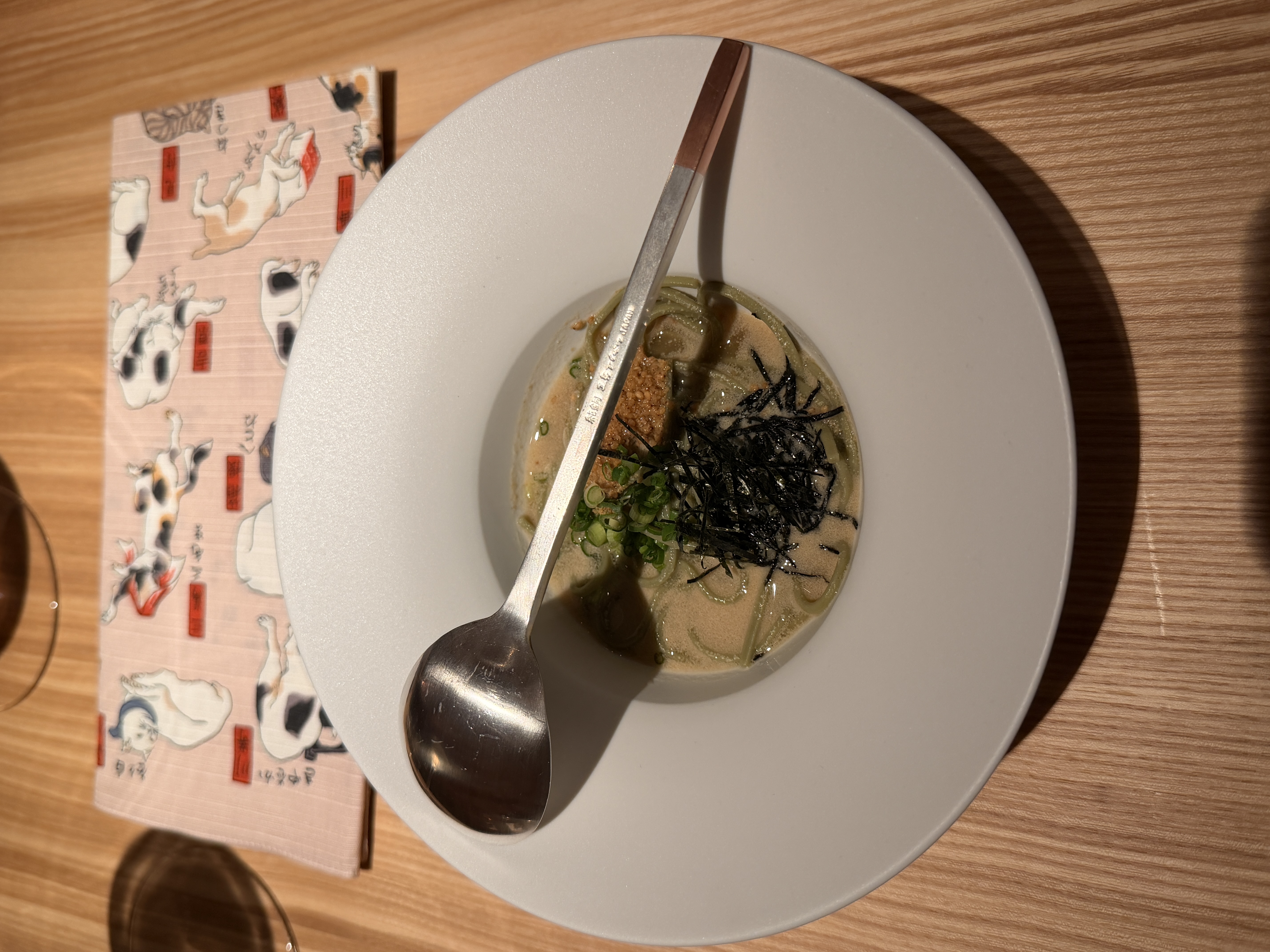 Попробовала фантастический холодный суп с соба и матчей зеленого цвета. Вкус… умами, хотелось добавки.