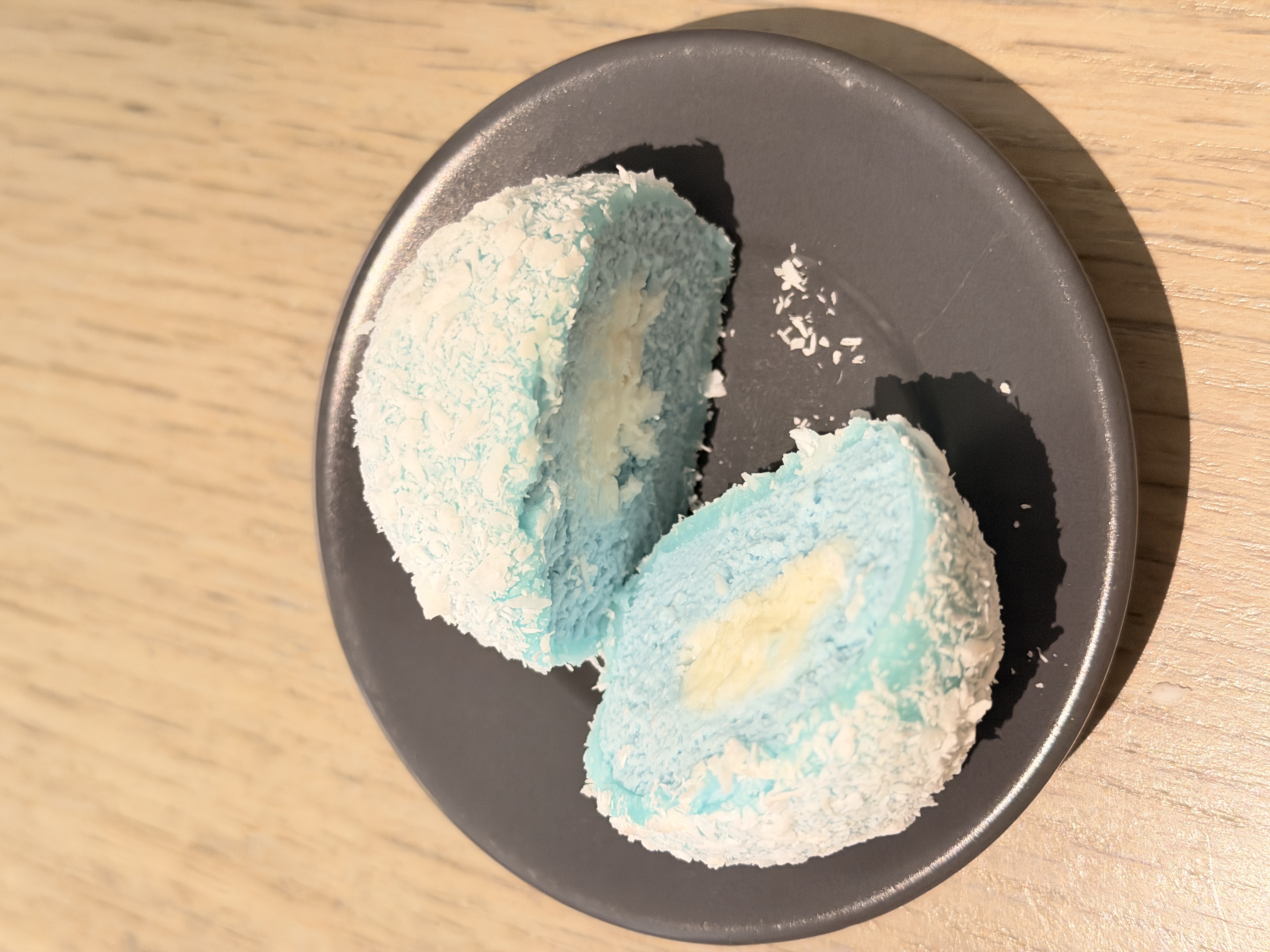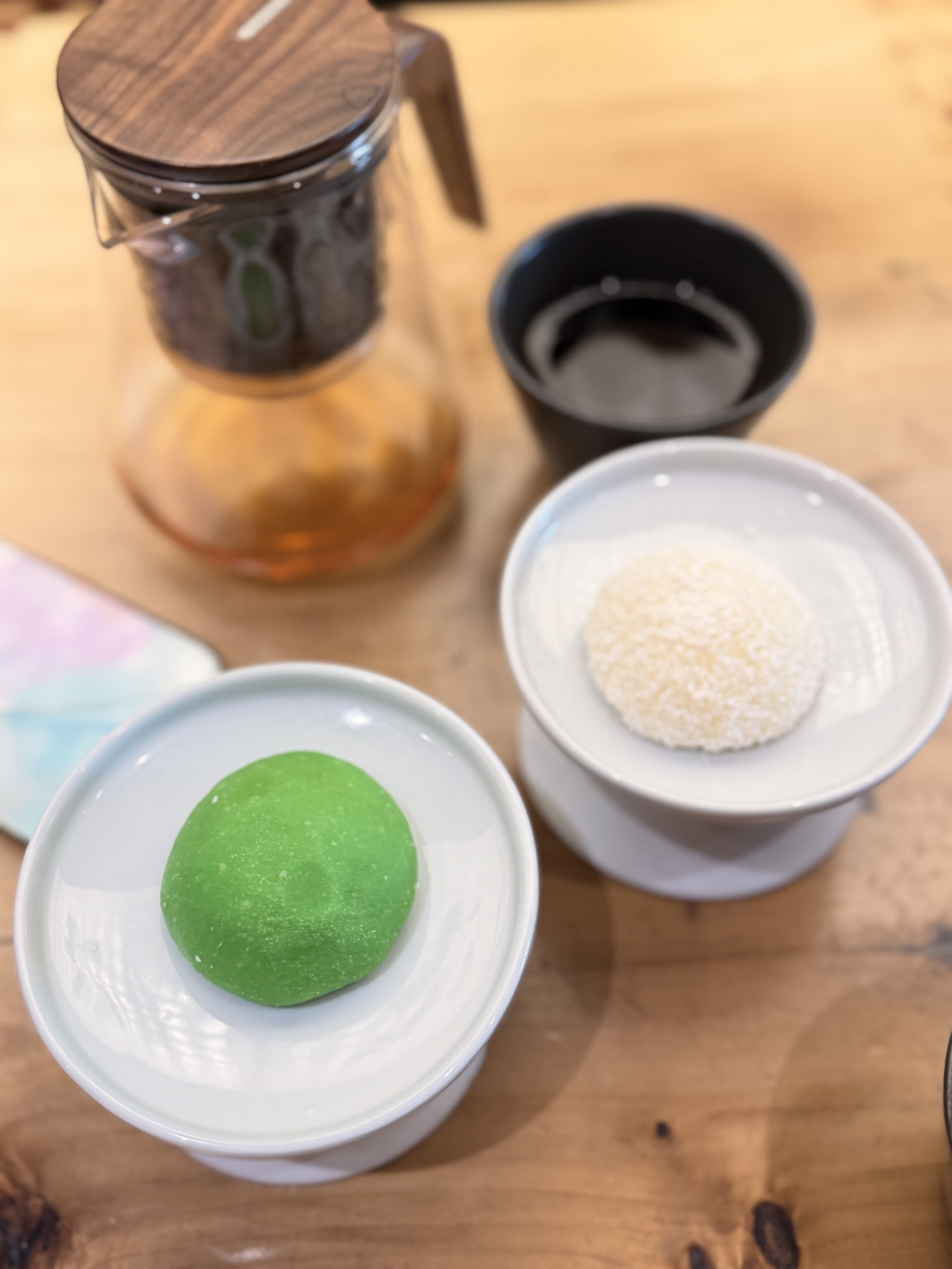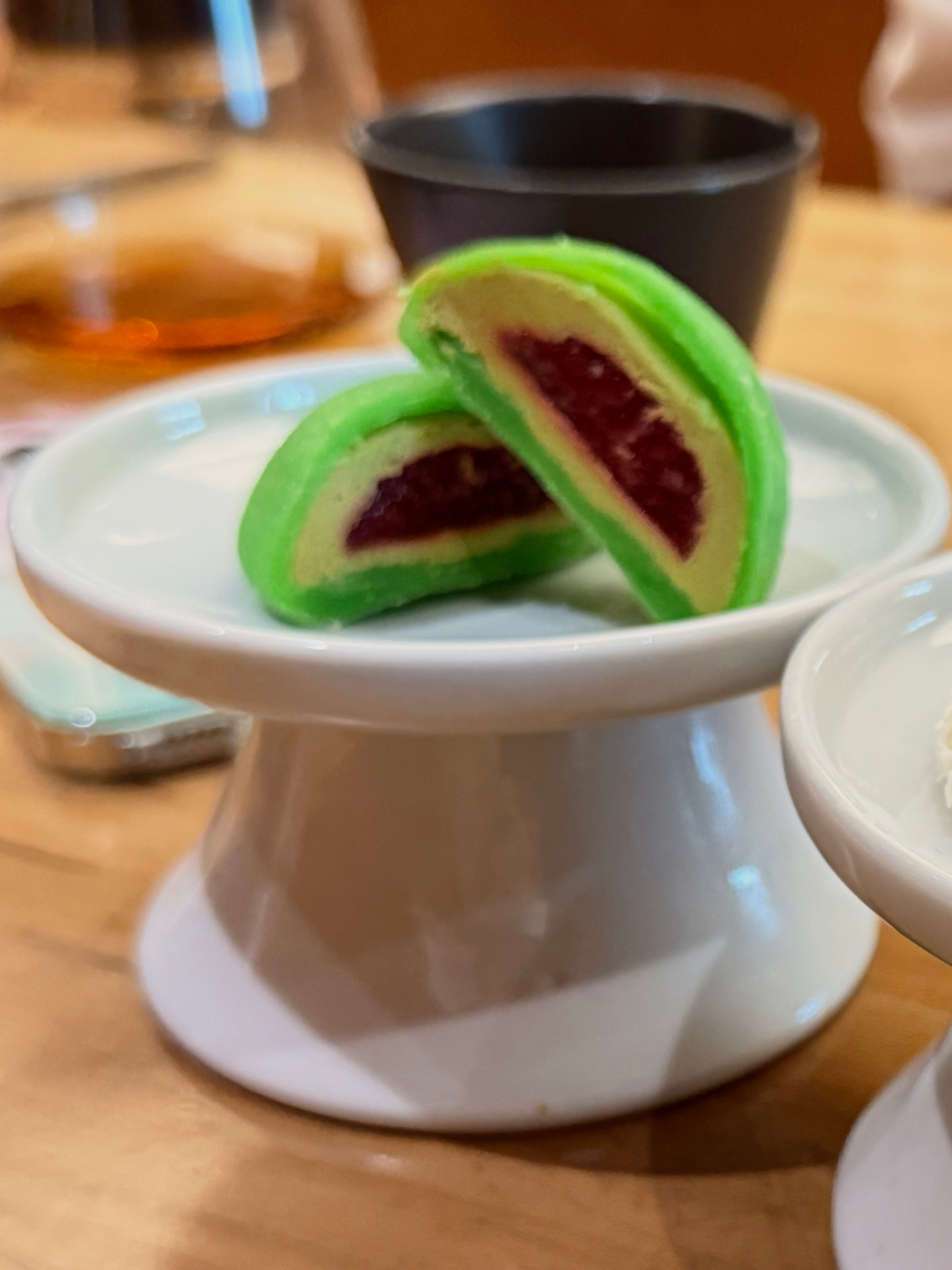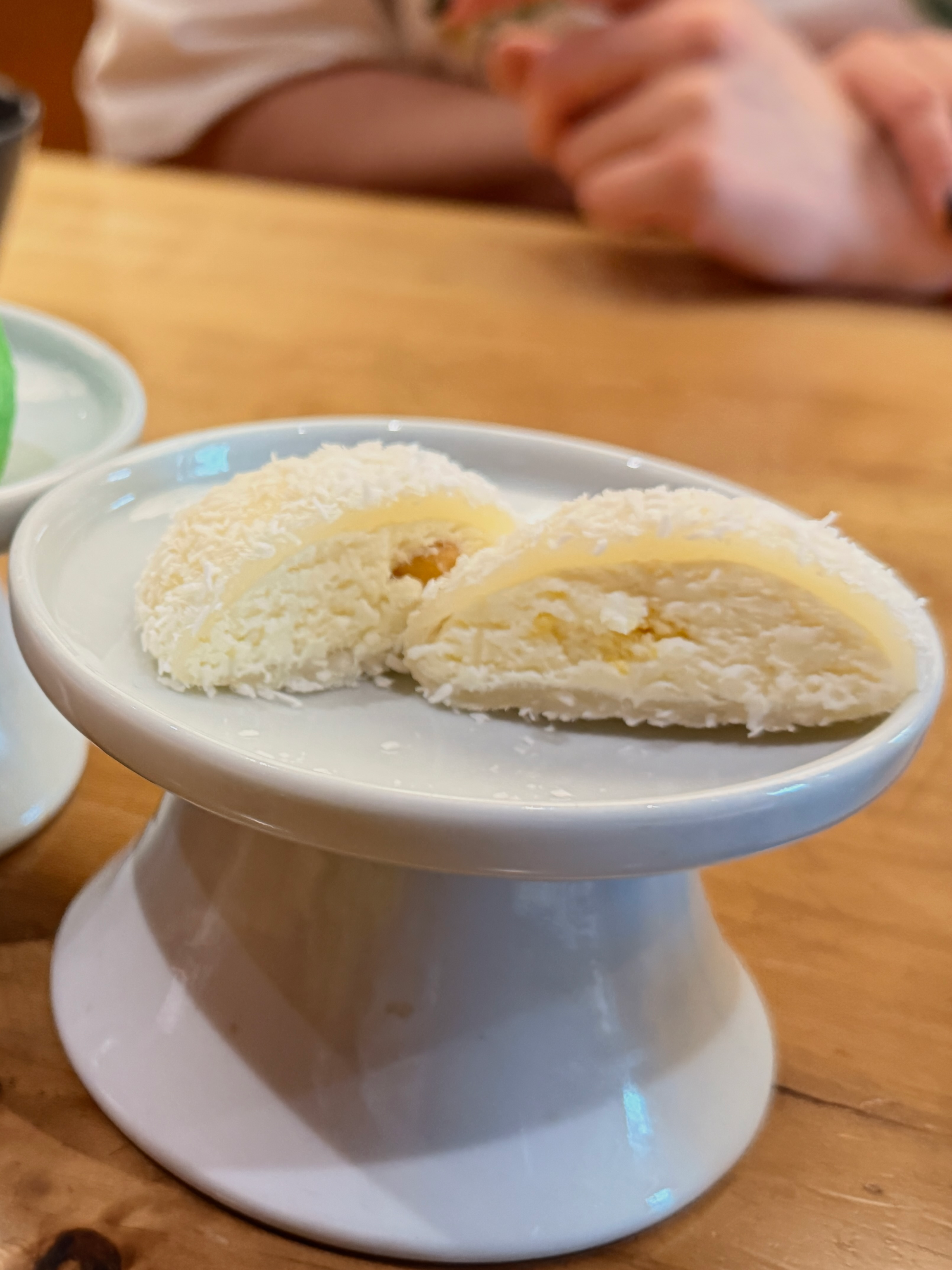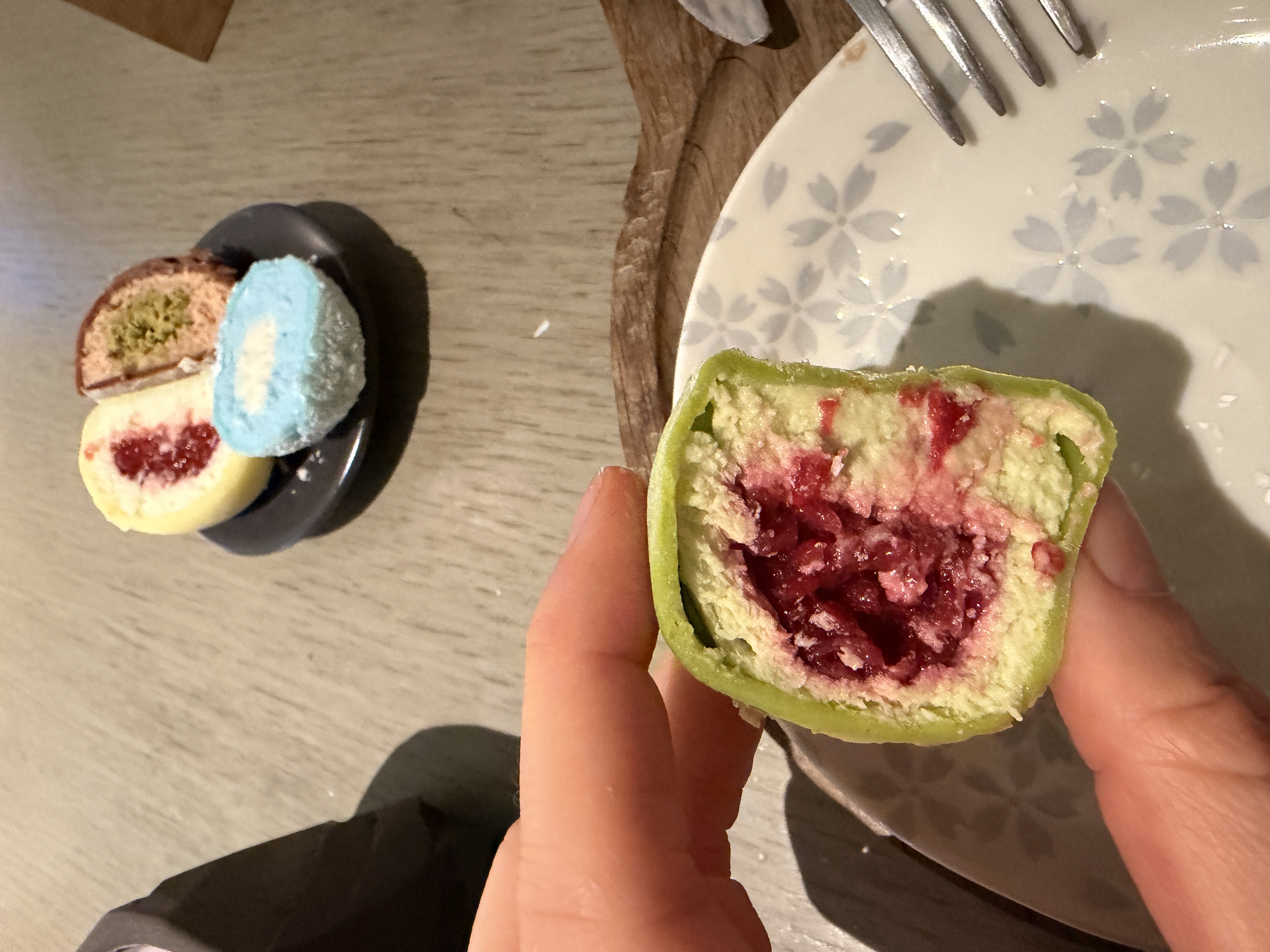Девочки ели моти: малина с фисташкой и кокосовое. Тоже у них попробовала по кусочку.