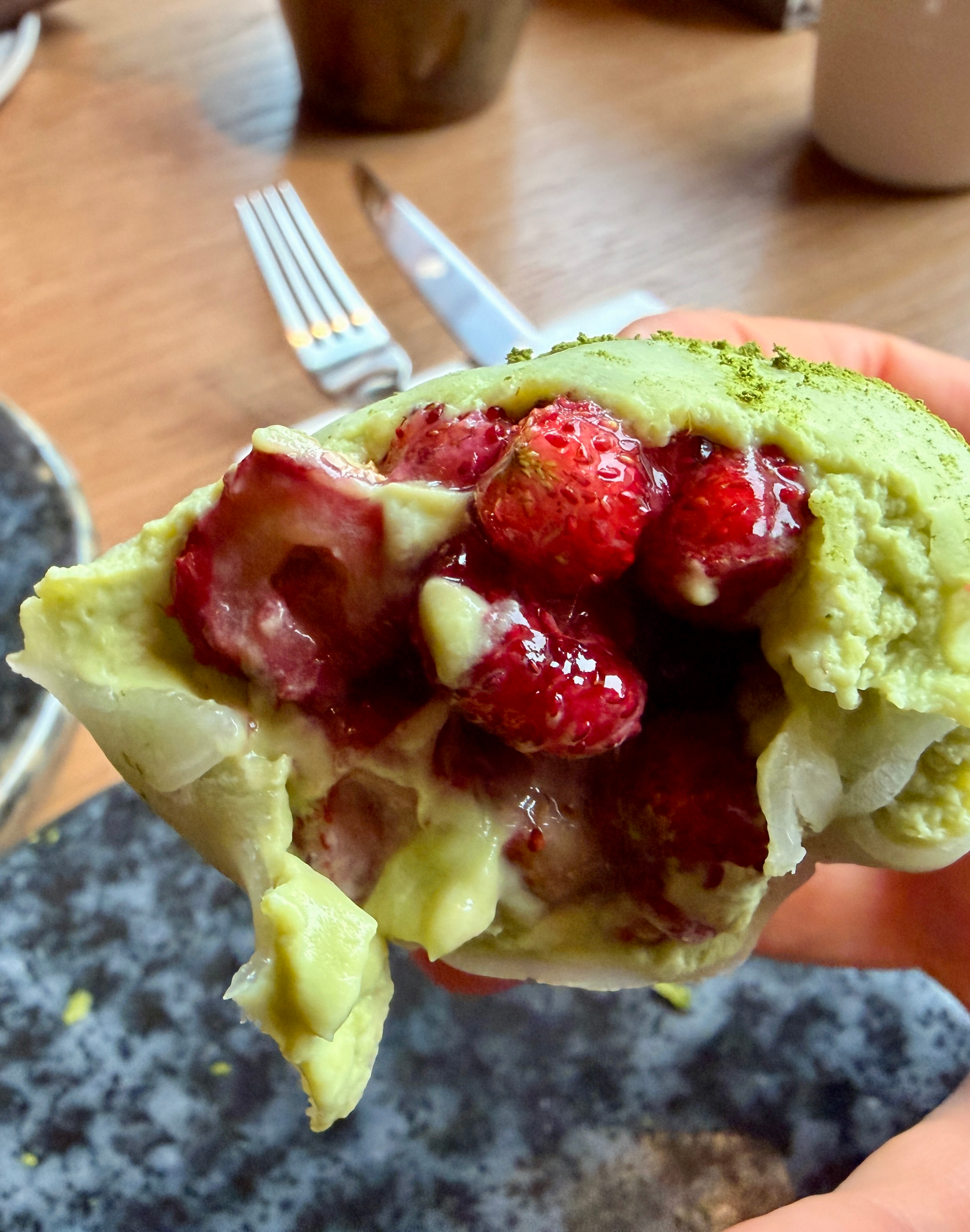 Ребята, я впервые в жизни ела моти с земляникой и это восторг!!! Забудьте все, что вы знали о моти до этого. Нежнейшая текстура, кусаю, чистую терпкость матчи, а внутри свежейшая земляника. Не верю глазам. Это просто вау. Какое тонкое сочетание вкусов.