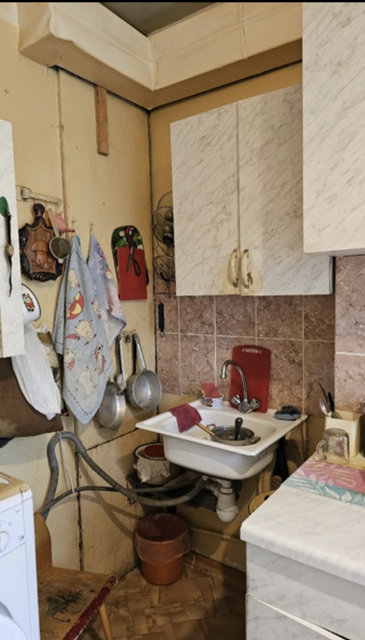Предлагала переставить холодильник и переместить раковину, убрать стиральную машинку в ванную, но хозяева не согласились, так же было предложено поклеить на старую плитку "как из пинтерест "пластиковую в цвет, но увы…