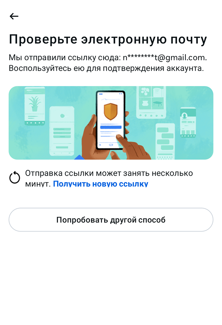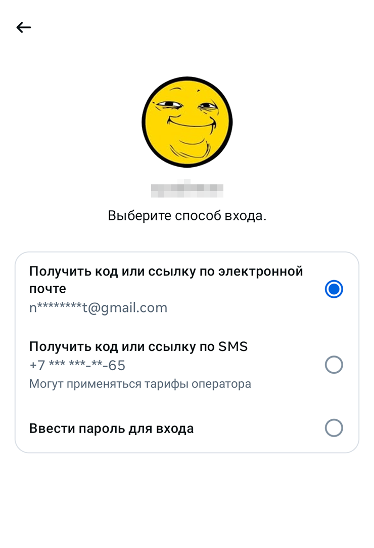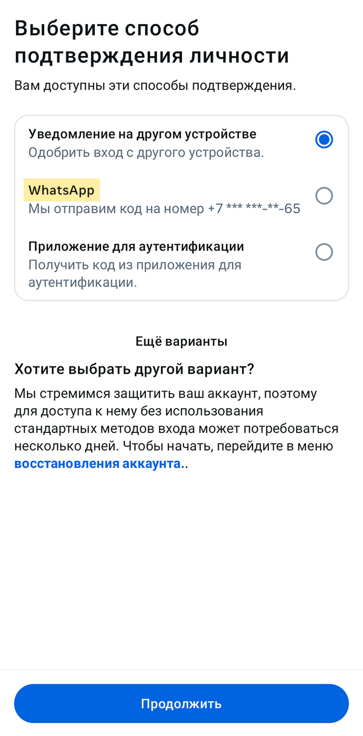 Вариант восстановления через «Вотсап»* предложат после второй или третьей попытки, когда появится кнопка «Попробовать другой метод». В остальном алгоритм не тот же — все как с почтой или смс.