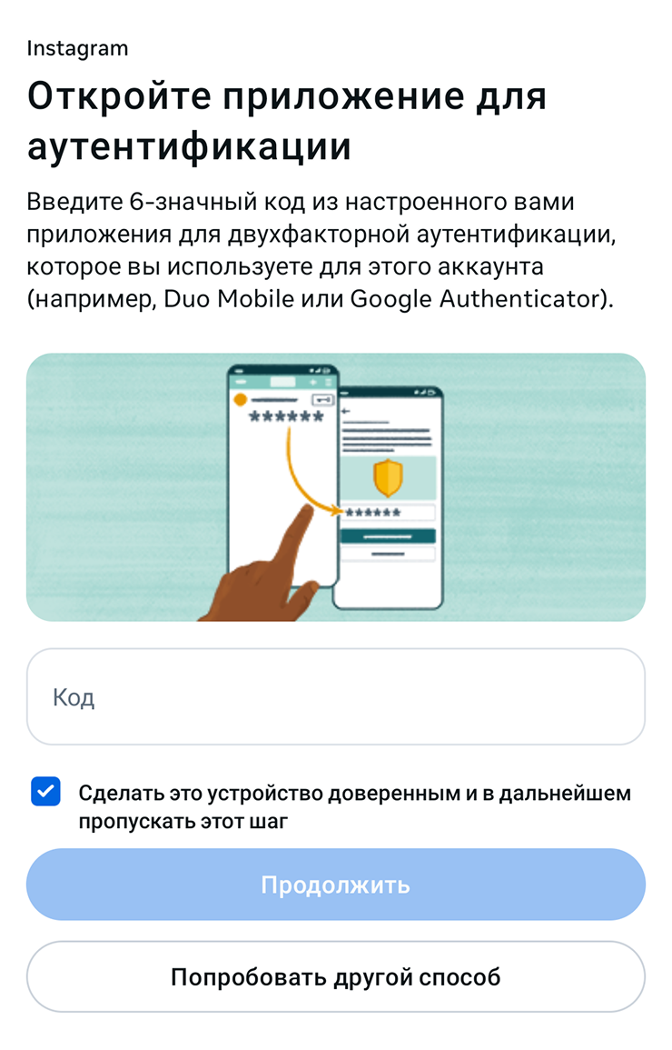 Восстановление доступа через другое устройство. Подойдет для случаев, когда надо войти в аккаунт на втором устройстве и известен аккаунт или почта, но не пароль. Для этого нужно выбрать вариант «Уведомление на другом устройстве» на этапе выбора способа подтверждения личности. Далее в «Инстаграм»* придет подтверждение входа — действие необходимо подтвердить.