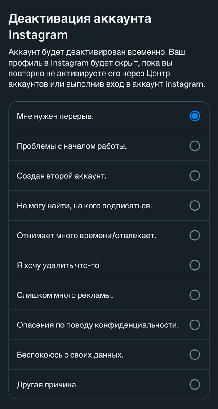 Добровольная деактивация аккаунта. Делается это так: «Настройки и действия» → «Центр аккаунтов» → «Личная информация» → «Владение и управление аккаунтом» → «Деактивация или удаление» → выбрать аккаунт → «Деактивация аккаунта» → «Продолжить» → ввести пароль → «Продолжить».
