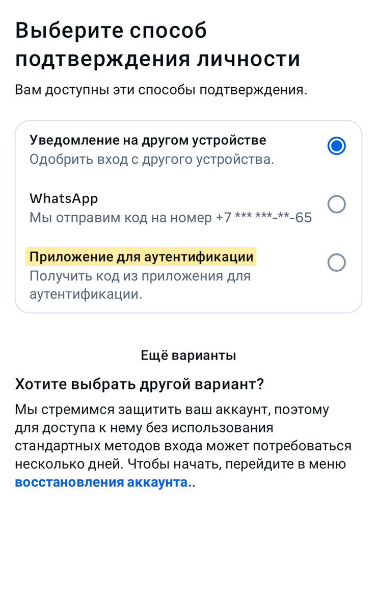 Для входа достаточно скопировать код из приложения и вставить его в соответствующее поле. Выбрать аутентификатор можно на этапе подтверждения личности, но он не всегда доступен. В тестах вариант приложения для аутентификации чаще появлялся на Android, чем на iOS.