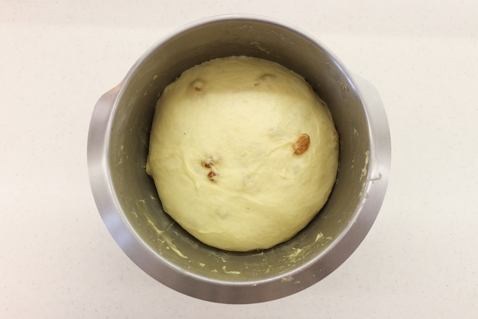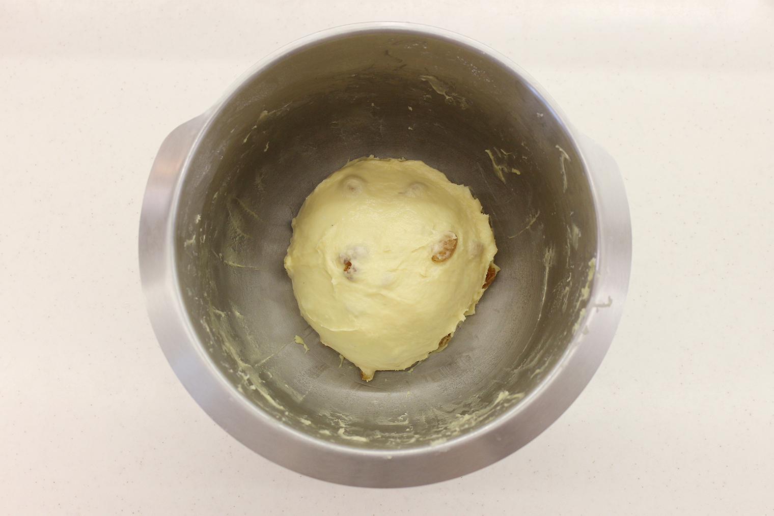 Шаг 6. Снизьте скорость миксера до минимальной. В несколько подходов добавьте изюм и мешайте еще 2 минуты.
