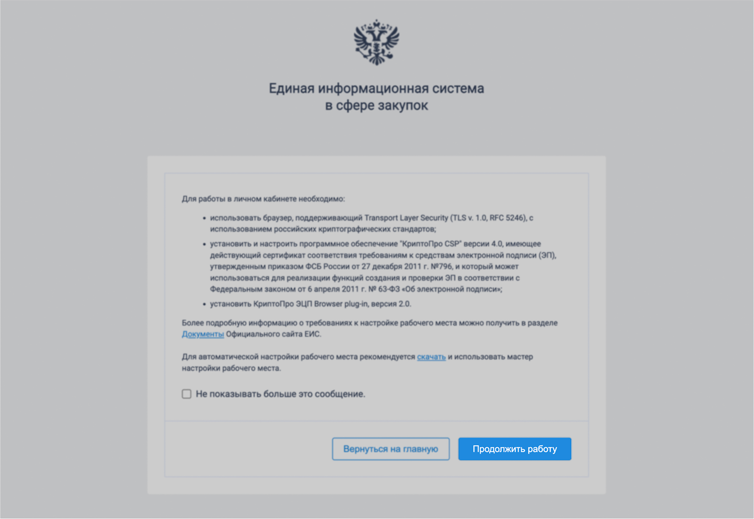 Настроить браузер можно на сайте ЕИС в разделе «Материалы в ЕИС» — «Файл для настройки рабочего места».