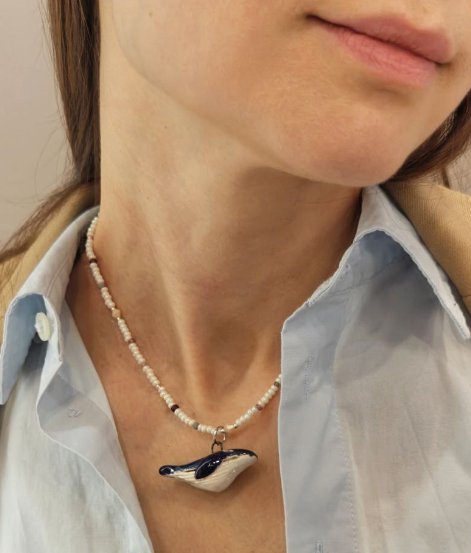 Мне понравилась их философия: украшения создаются для мам и дочек с 2022 года. MaMI — аббревиатура фразы Mama is My Influencer (мама — мой инфлюенсер). Я преподнесла Марине подвеску из мерцающего жемчуга с синим китом, а маленькая Амелия, ее доченька, уже заглядывается на такую же.