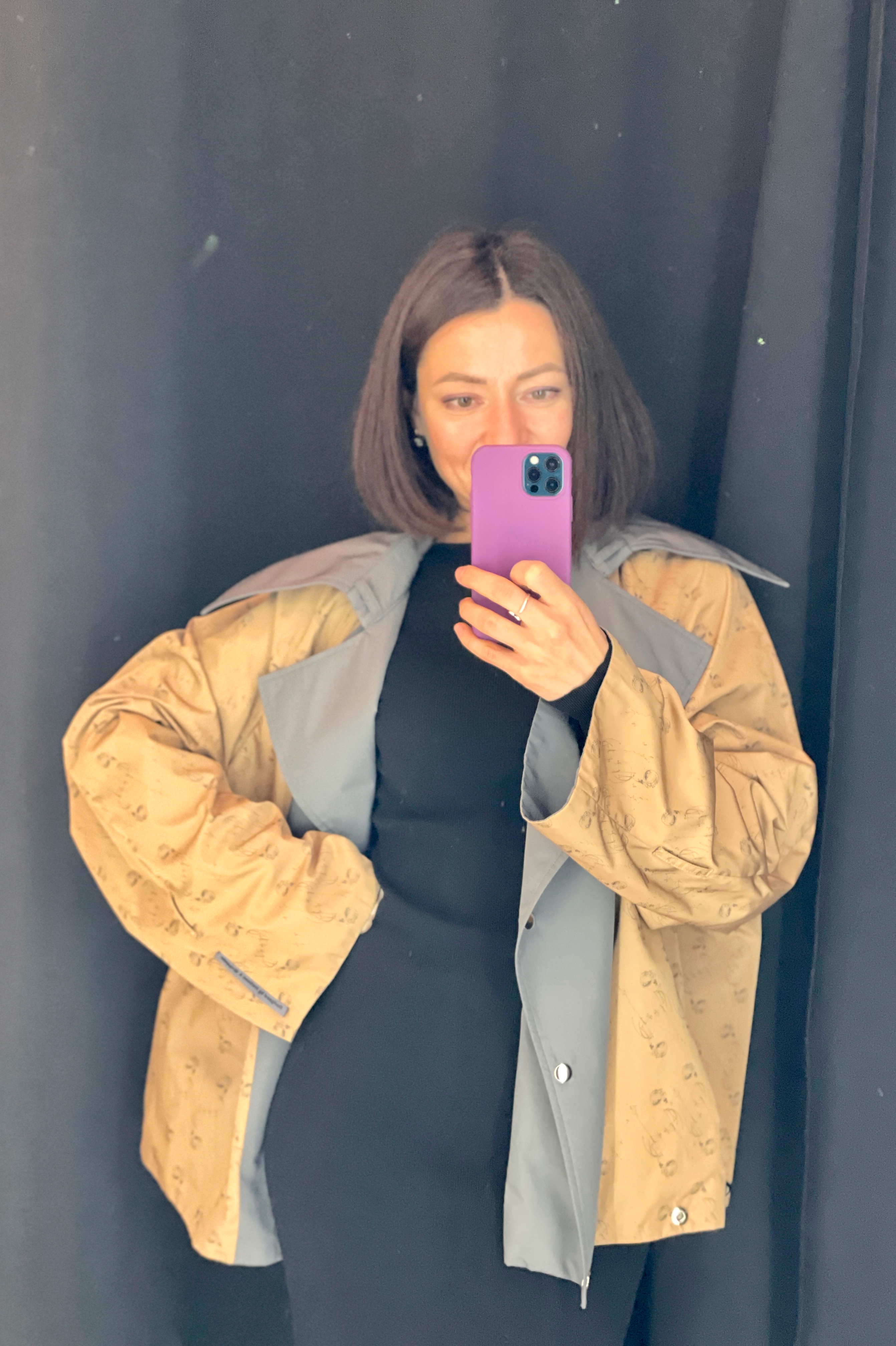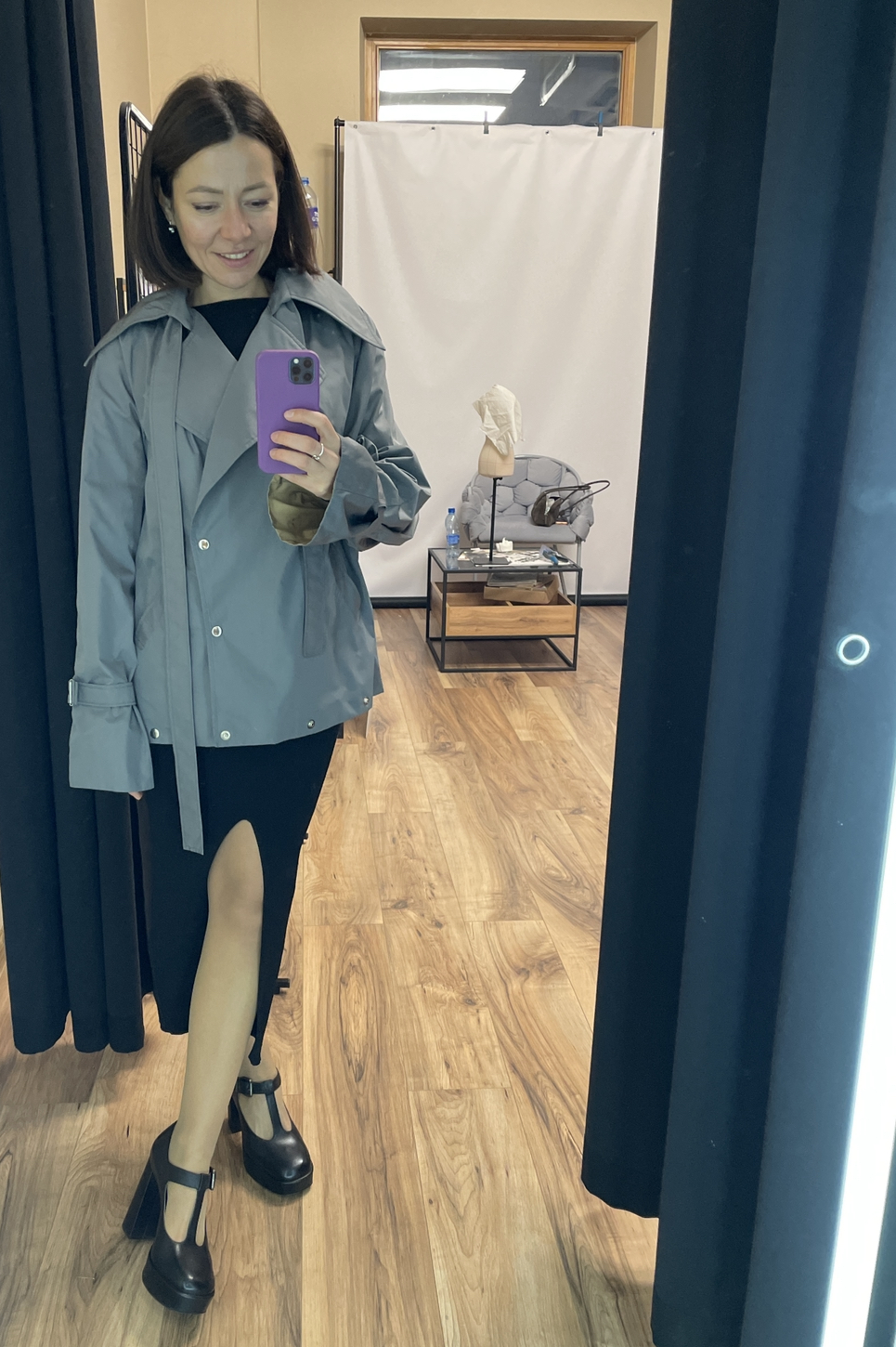 Я насчитала более восьми способов ношения — калейдоскоп преображений, подвластный настроению и ритму жизни. Мне нравится, что плащ/куртка/тренч круто смотрится и с платьем, и с джинсами, даже со спортивным костюмом носила, потому что за счет клепок меняю функционал и цвет изделия.
