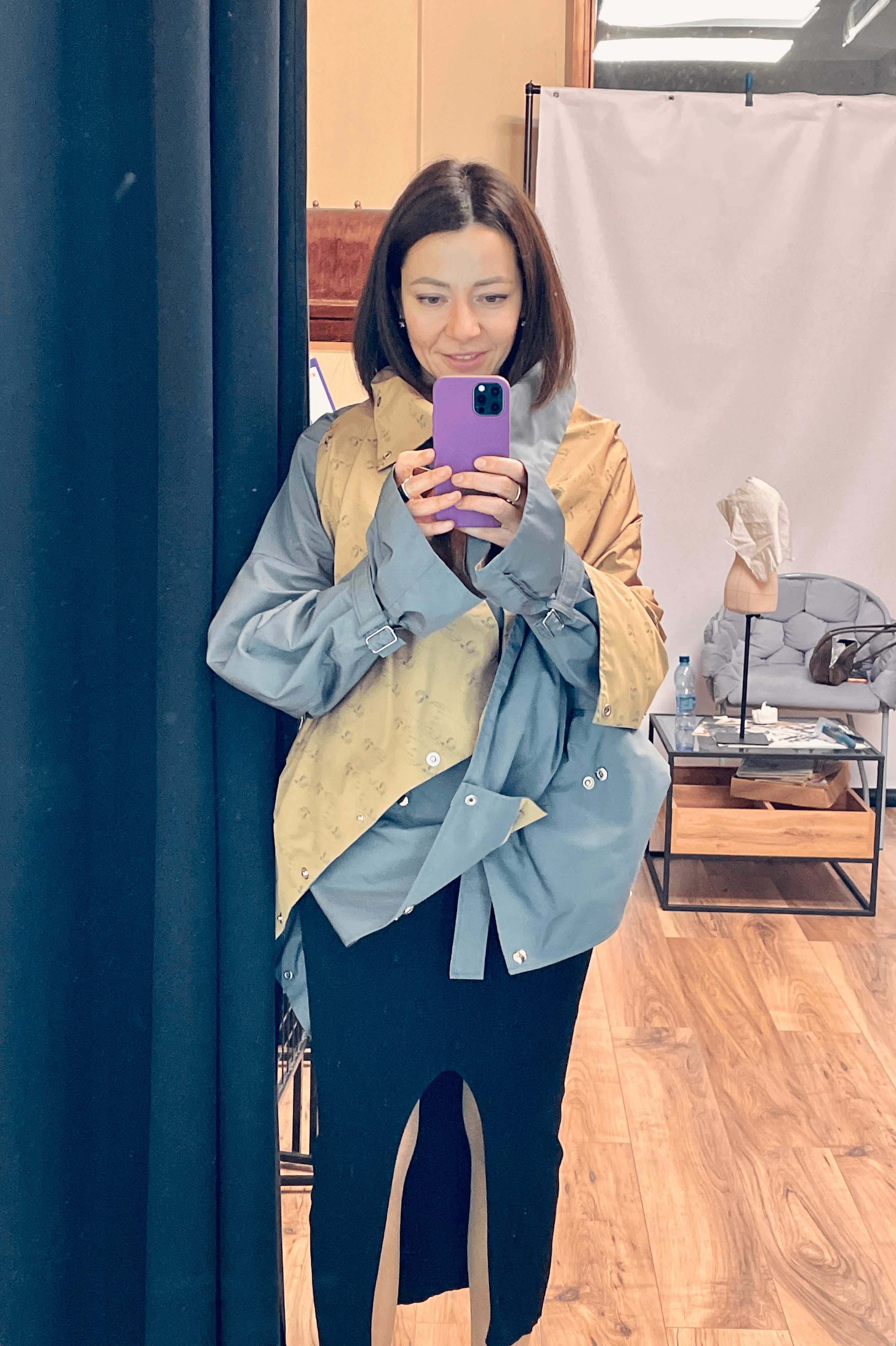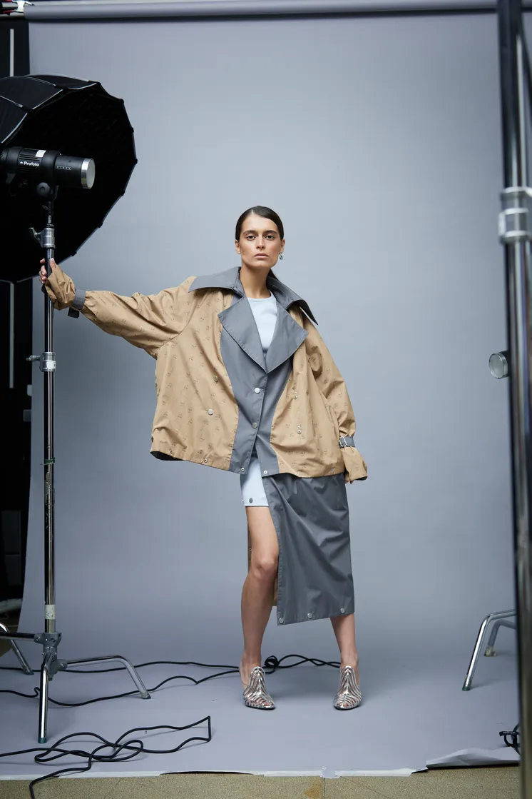 Мне понравился подход к разработке изделия, в которое я влюбилась, он называется деконструкция. Пока длилась примерка, мне рассказали, что принципы деконструкции и трансформации вдохнули жизнь в этот невероятный тренч-трансформер, не имеющий аналогов в мире.