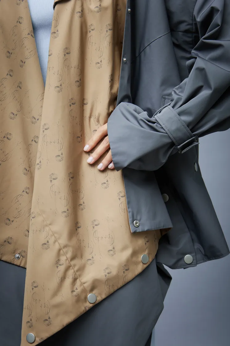 Горчичная сторона (подклад) украшена авторским принтом, задающим изделию ритм и динамику. Обе стороны выполнены из высококачественной плащевой ткани, надежно защищенной специальной водоотталкивающей пропиткой.