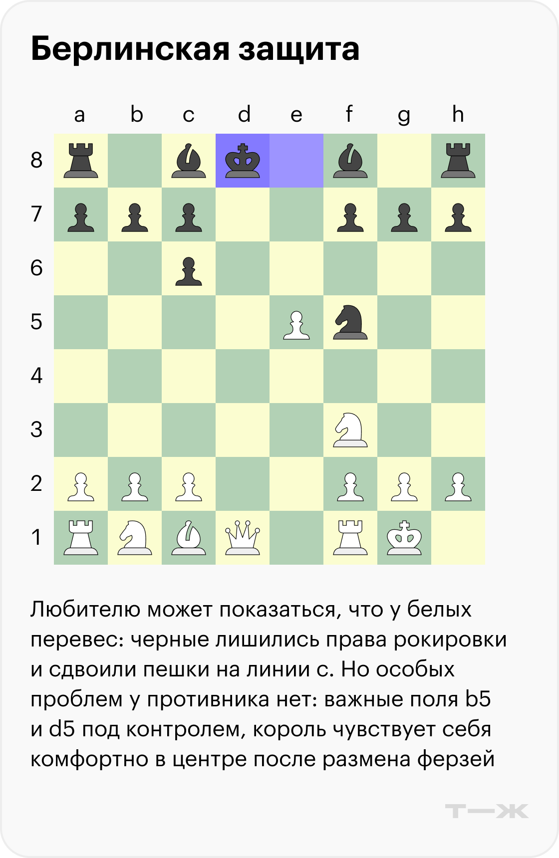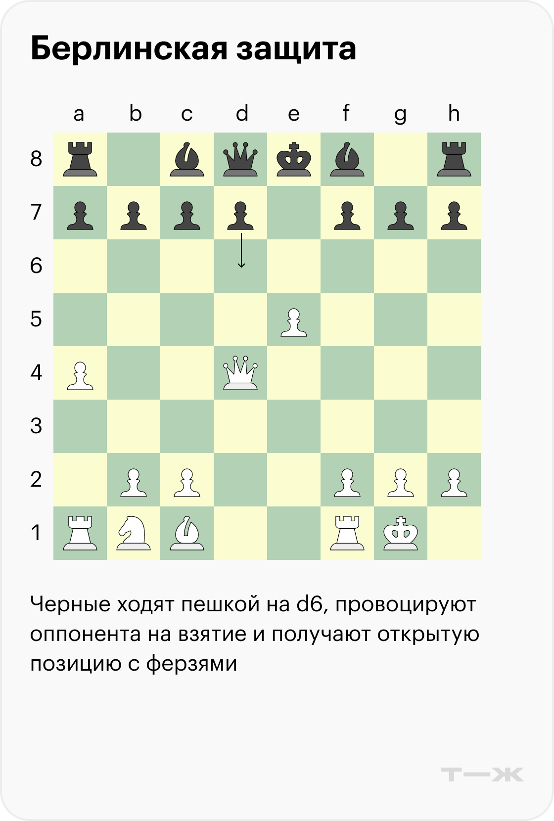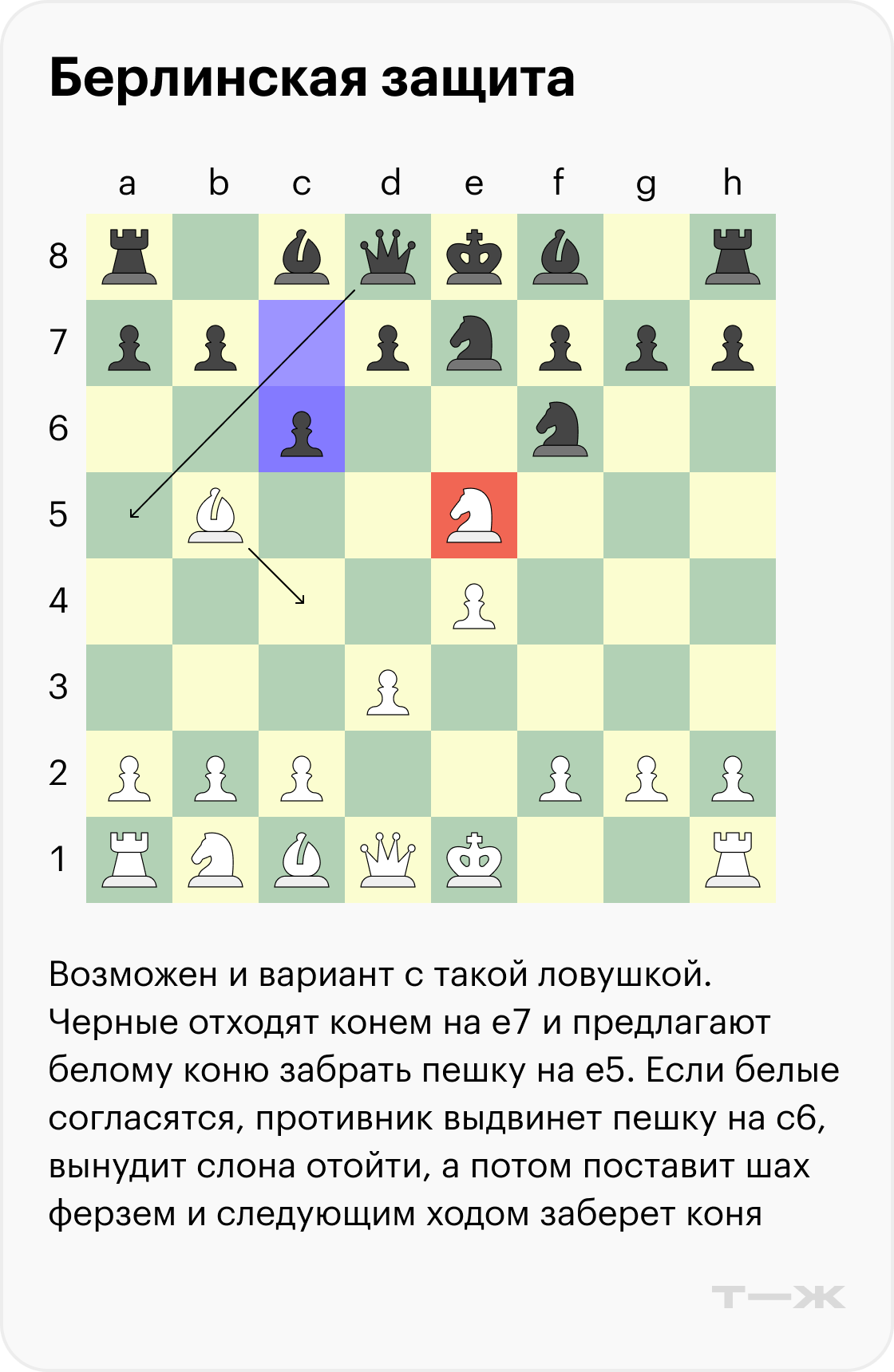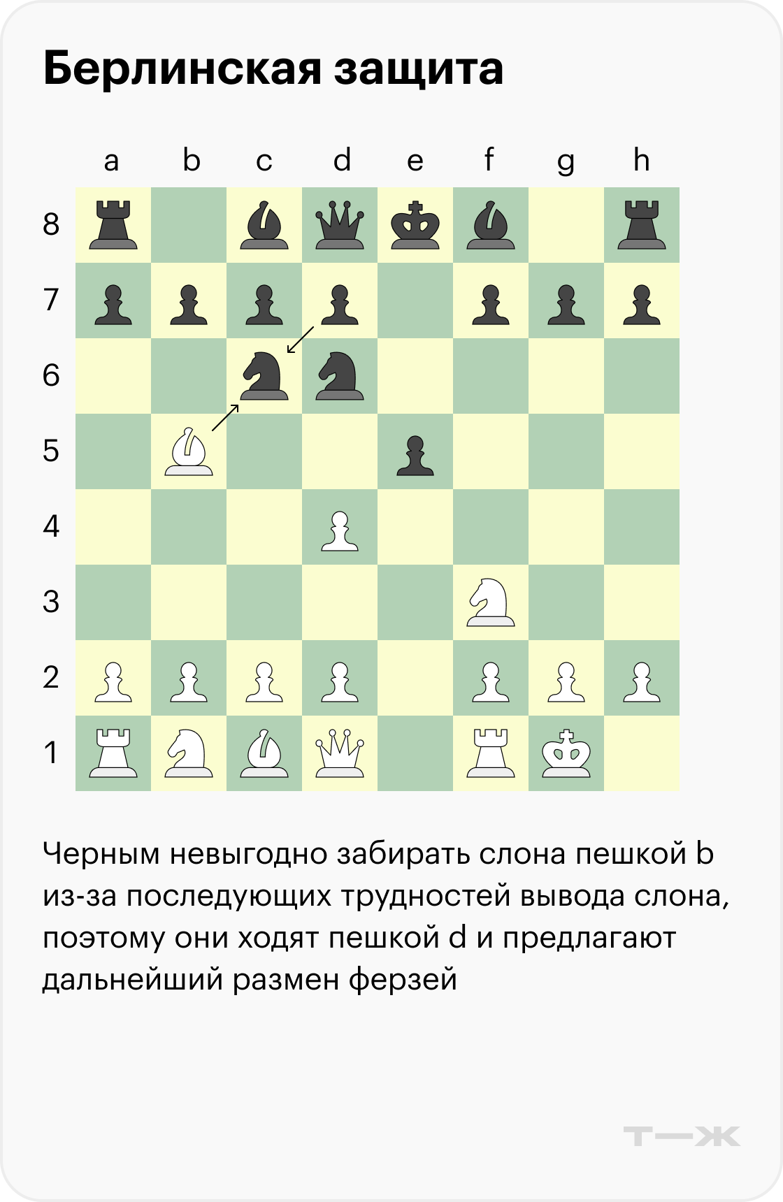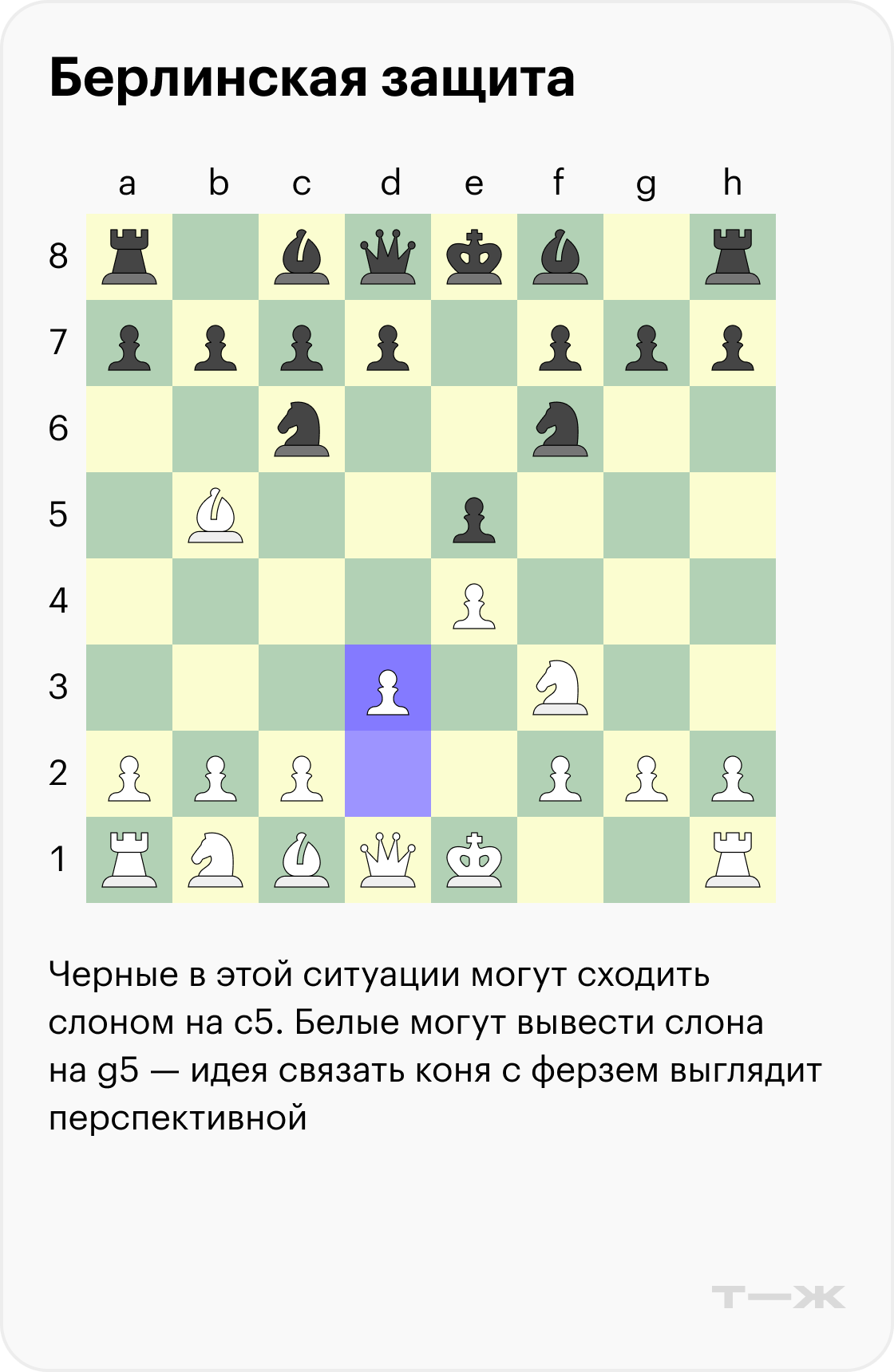 Когда игрок не согласен на ничью и хочет более сложной позиции, обычно в берлинской защите выбирают ход пешкой на d3. У черных есть несколько ответов, самый популярный — логичный выход слона на c5.