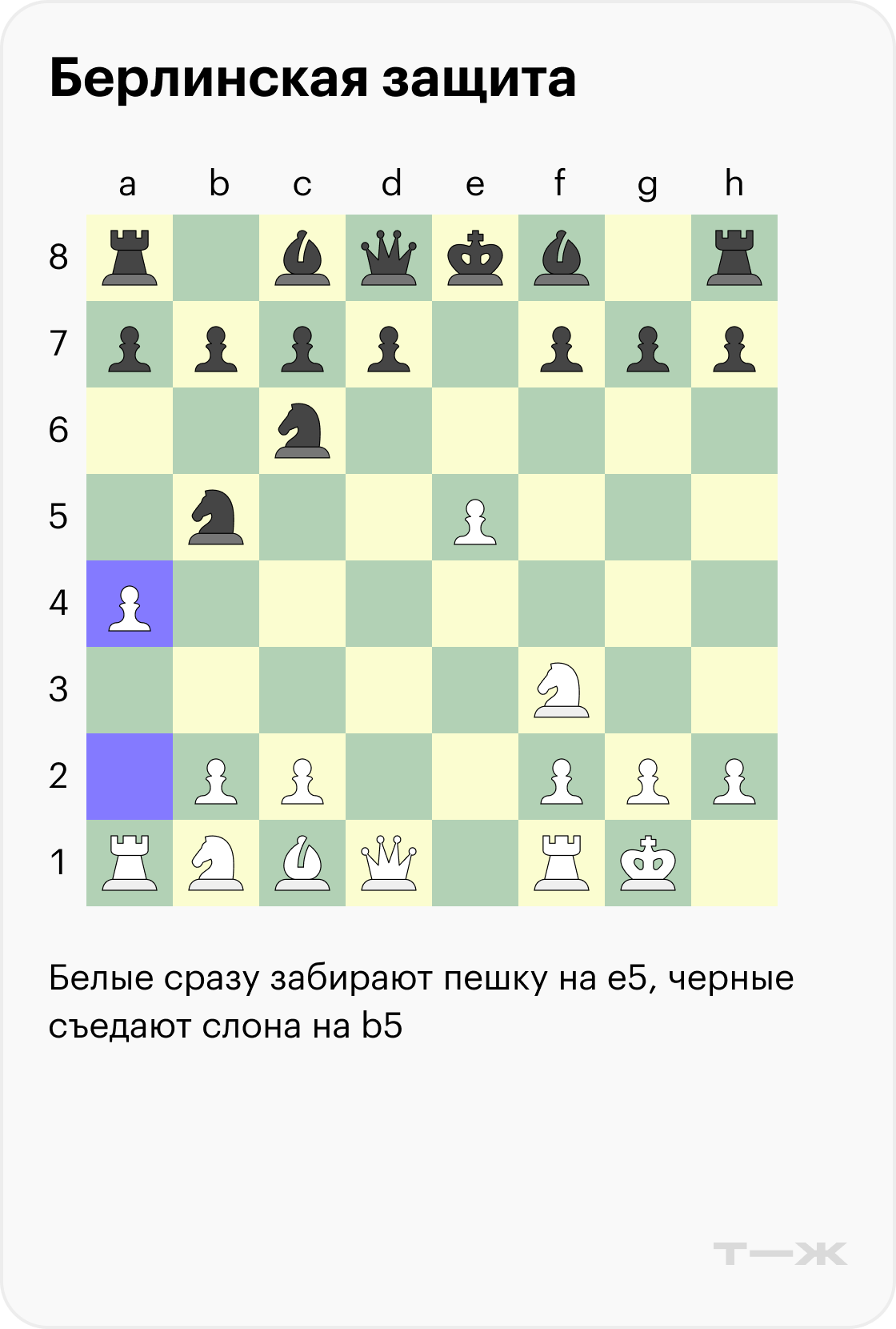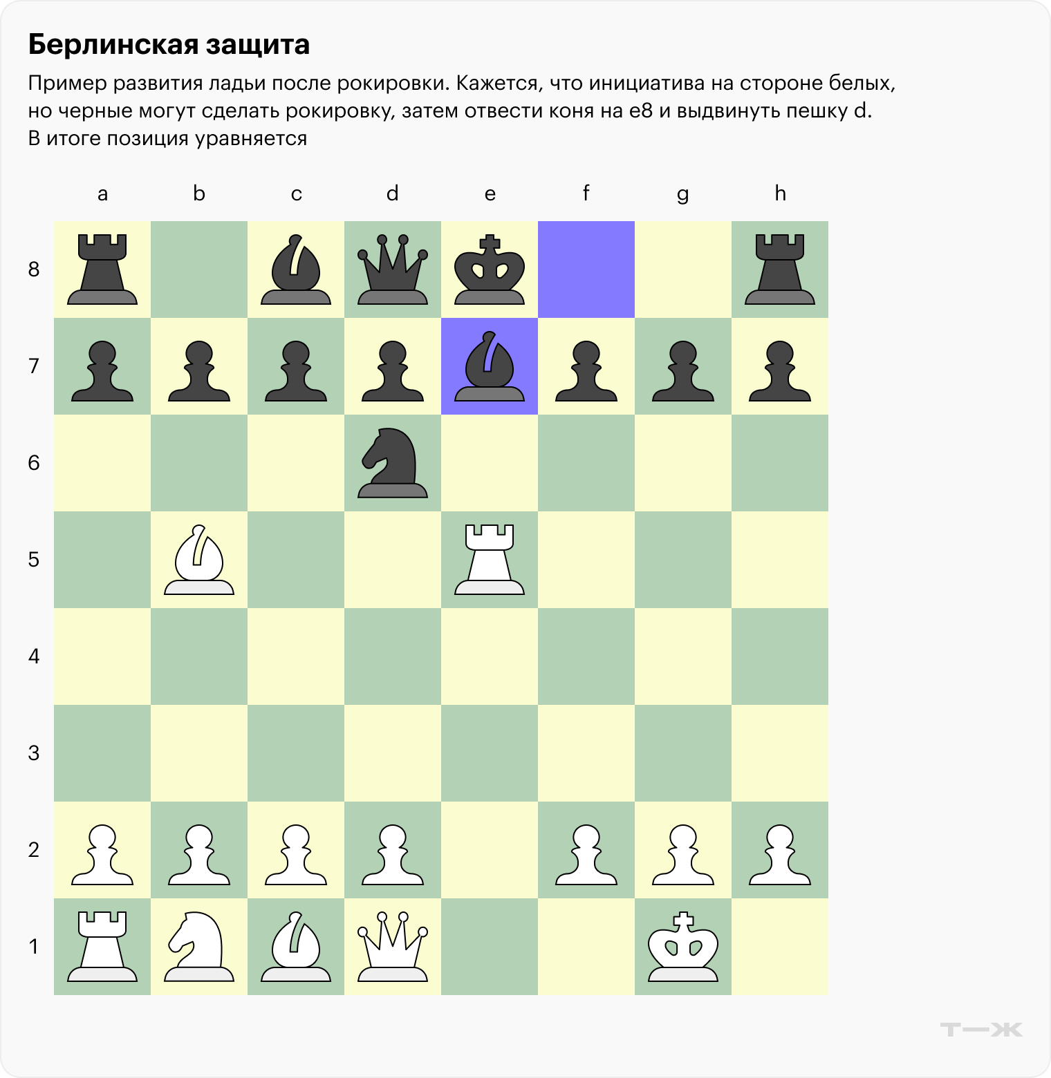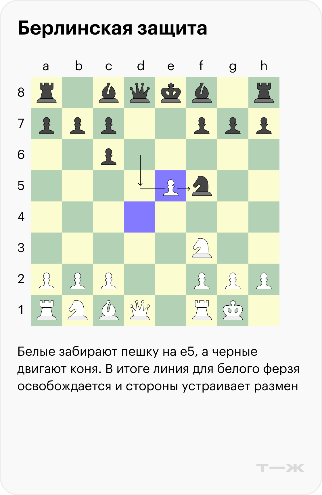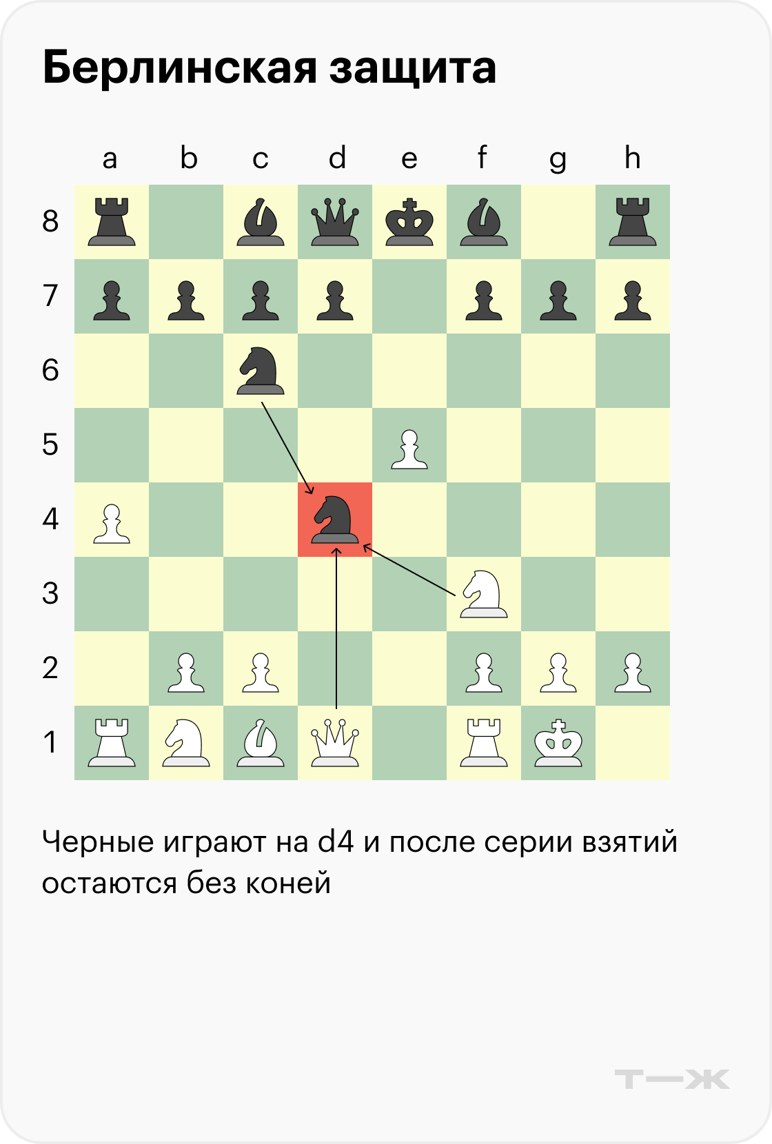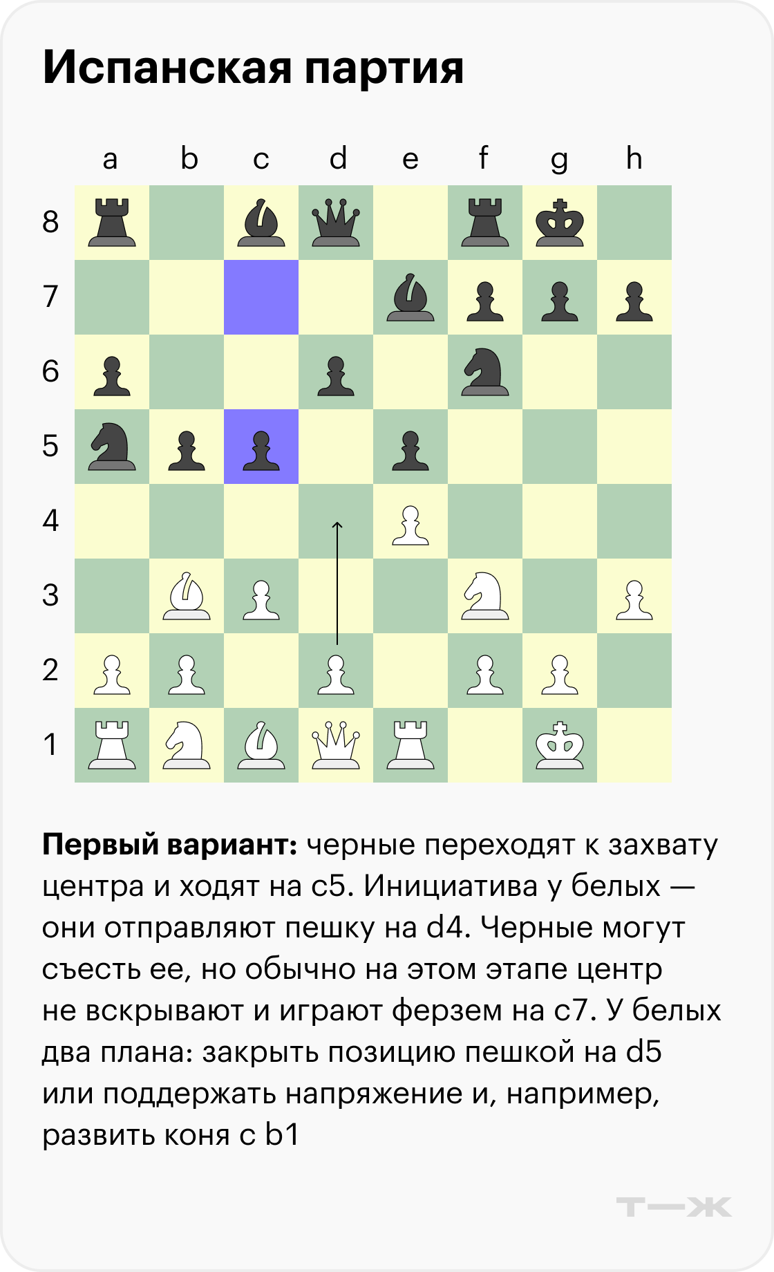 Когда игрок не согласен на ничью и хочет более сложной позиции, обычно в берлинской защите выбирают ход пешкой на d3. У черных есть несколько ответов, самый популярный — логичный выход слона на c5.