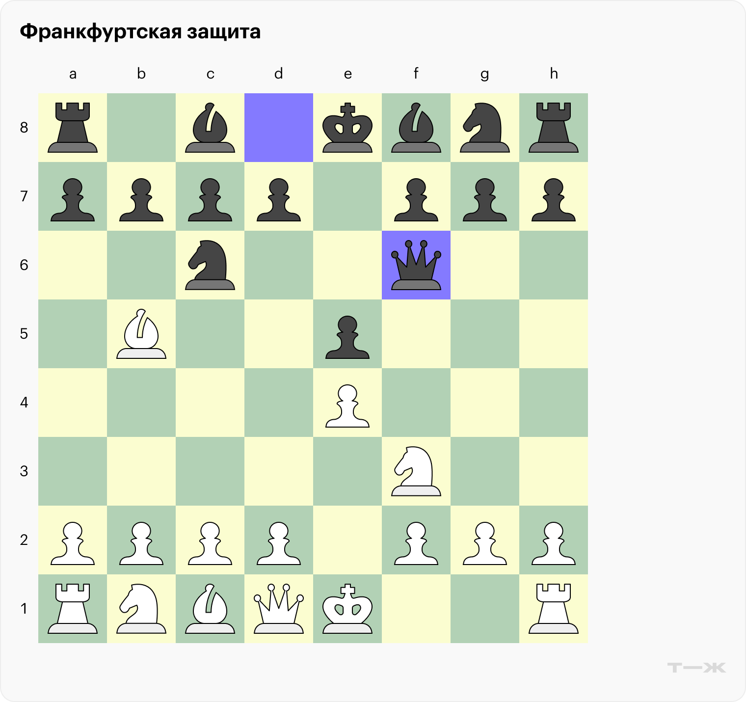 Франкфуртская защита (3…Qf6). Начинающие шахматисты очень любят ход ферзем на f6: фигура берет под защиту и коня, и пешку. Но в базовой теории дебютов считается, что ранний выход сильнейшей фигуры редко бывает правильным — и этот случай не исключение.