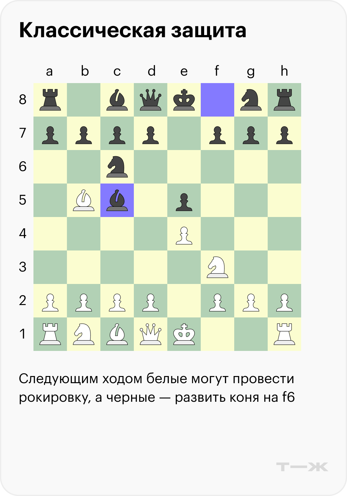 Классическая защита (3…Bc5). Некогда очень популярный вариант с ходом слоном на с5, который и сейчас можно встретить в партиях шахматистов разного уровня. Назвать ход плохим будет преувеличением: сегодня все сценарии проанализированы компьютерами и даже среди не самых удачных можно найти эффективные, поэтому играть можно практически любое продолжение. Но такой вариант не создаст противнику особых проблем.
