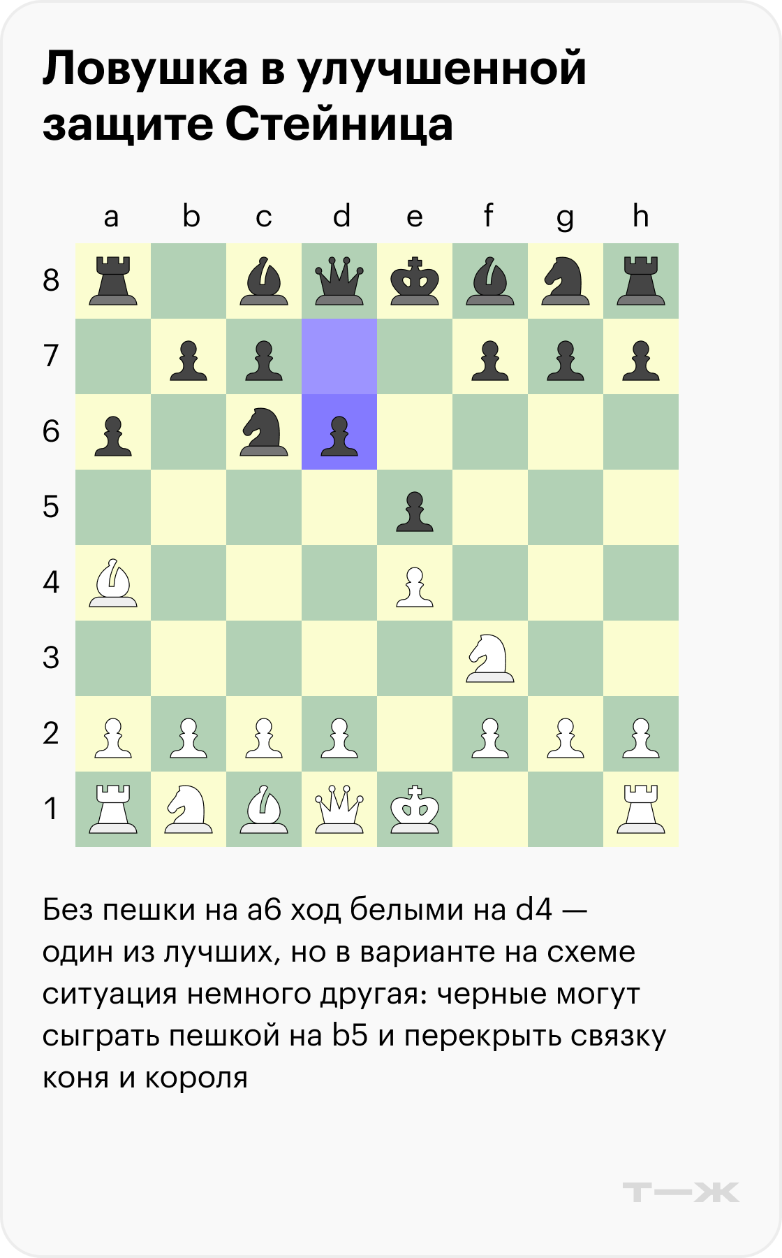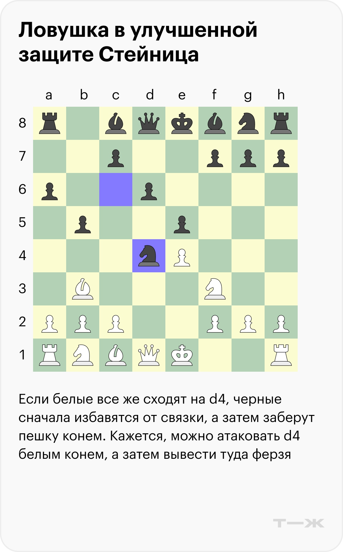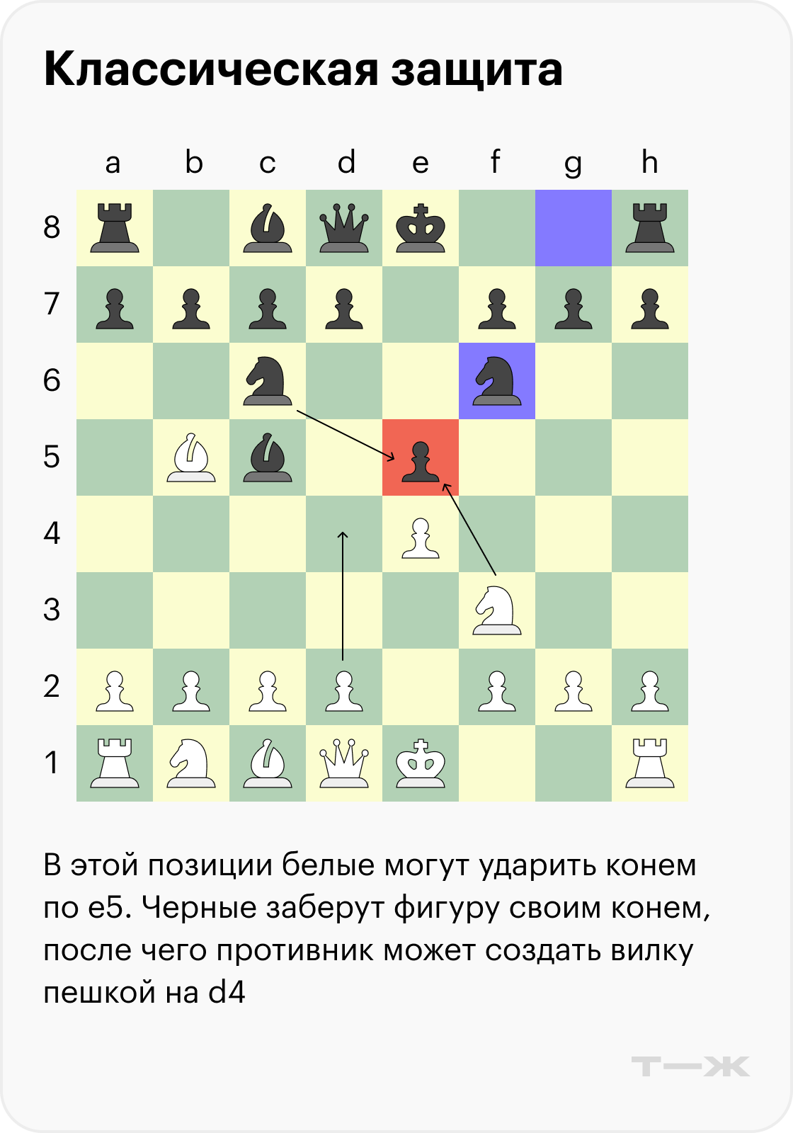 Черные ходят конем на d4 и оставляют пешку e5 под боем. Они рассчитывают, что противник по невнимательности атакует ее конем, а сами они заберут слона на b5. Волноваться белым не о чем — можно разменять коней на d4 и спокойно завершить развитие.