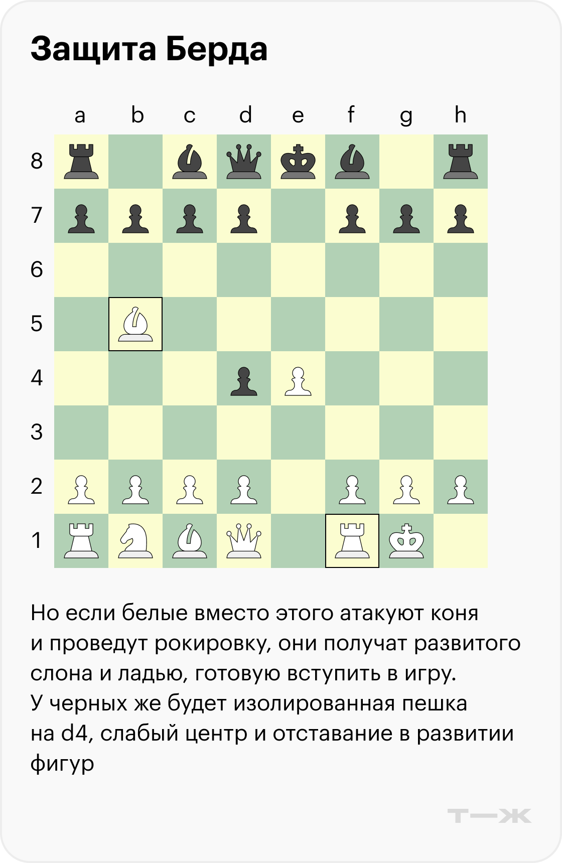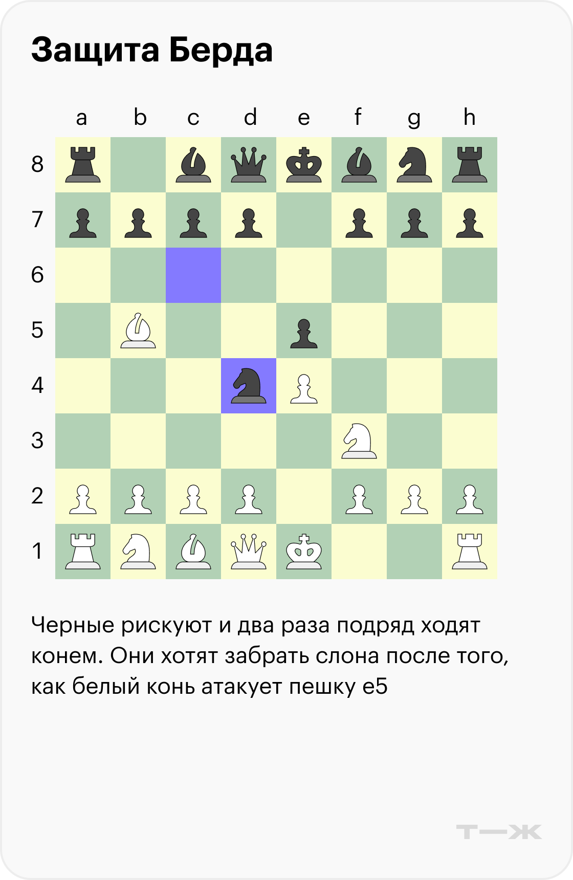 Защита Берда (3…Nd4). Черные создают ловушку, но, по статистике, в нее попадает меньше одного процента шахматистов.