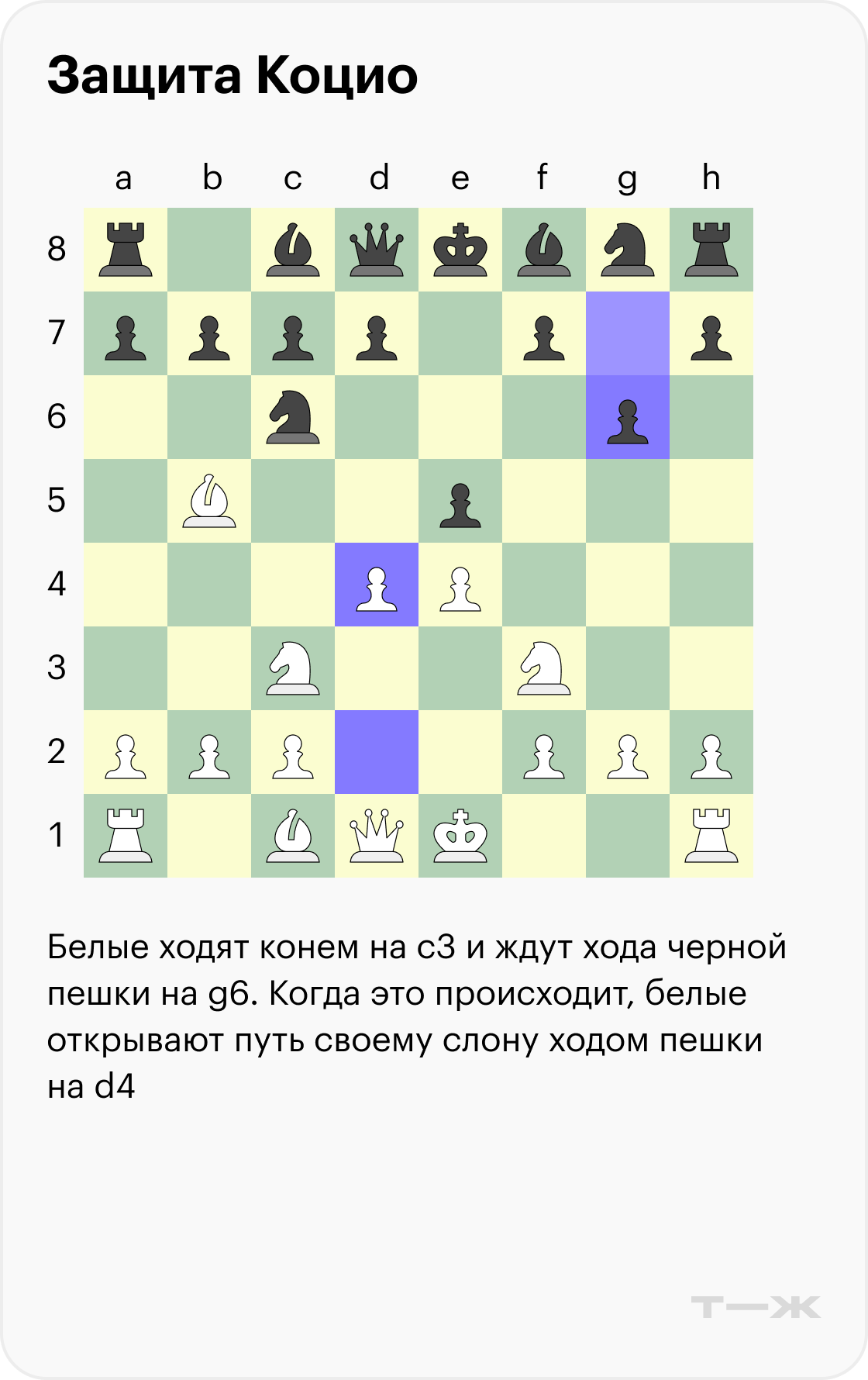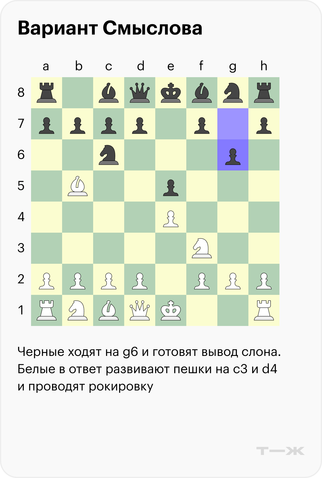Вариант Смыслова (3…g6). По сравнению с защитой Коцио здесь белые выбирают стандартное продолжение с игрой по центру. Можно сразу сходить конем на с3 и пешкой на d4, а потом провести рокировку — или наоборот.