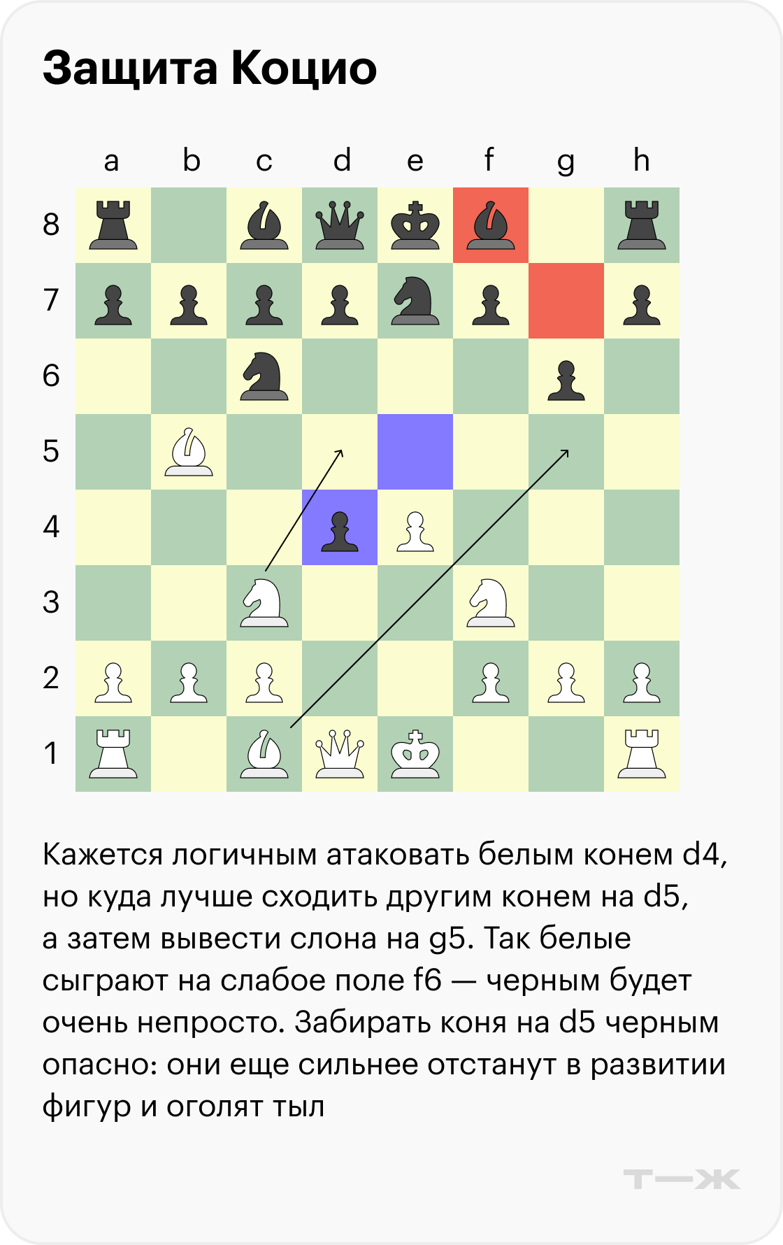 Одна из ключевых идей черных — забрать пешку на e4, затем отскочить конем на d6 и напасть на слона.