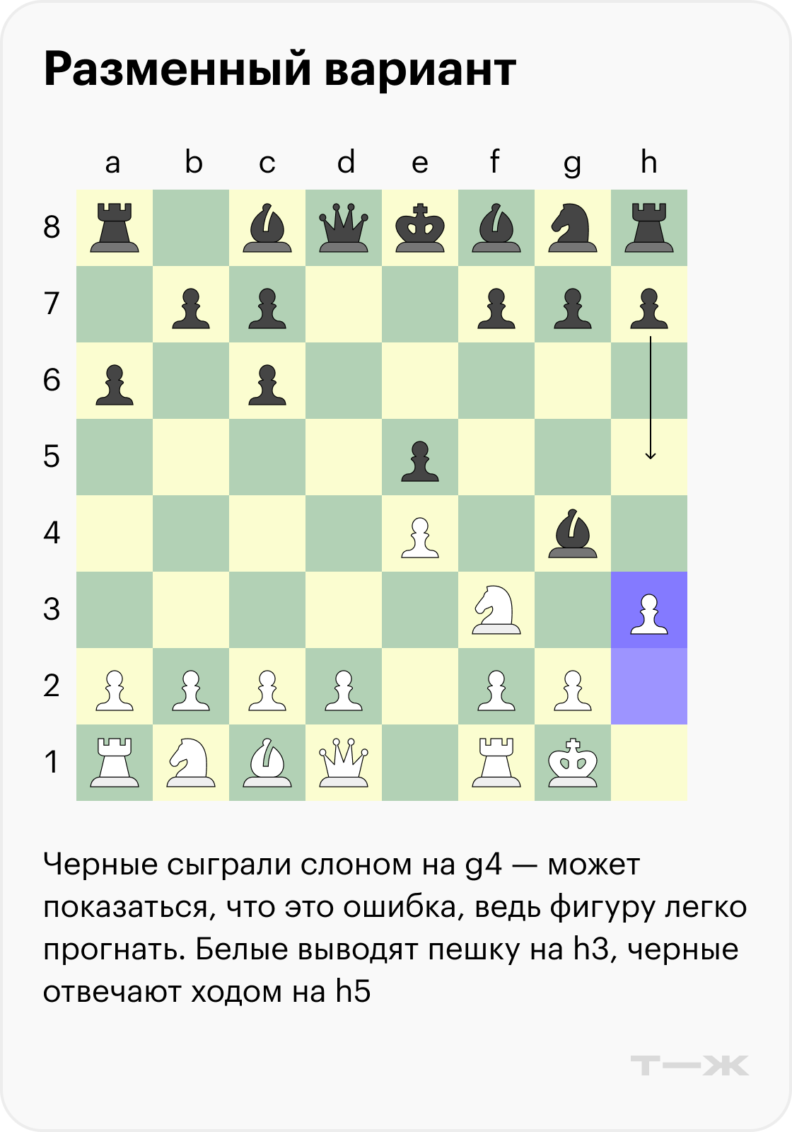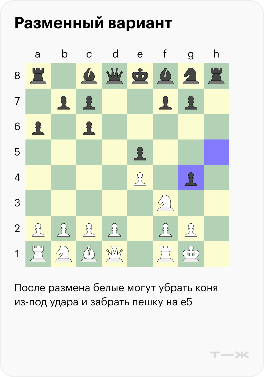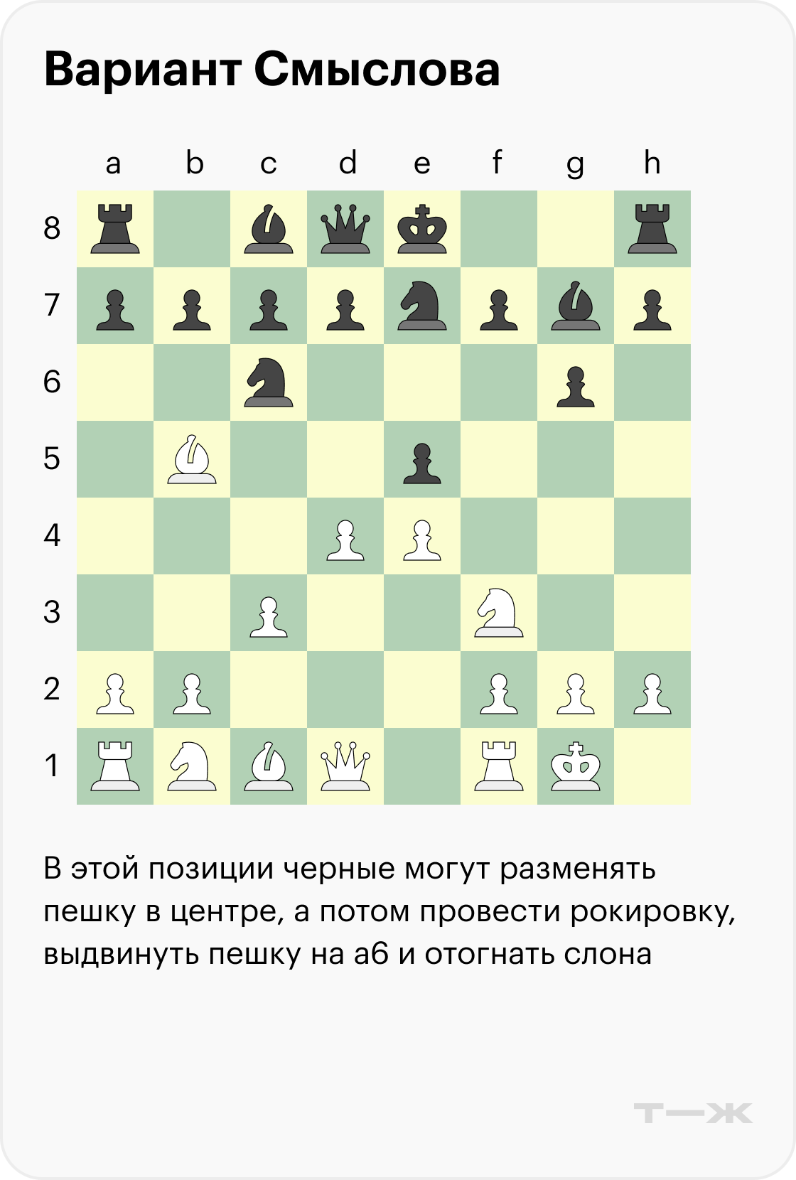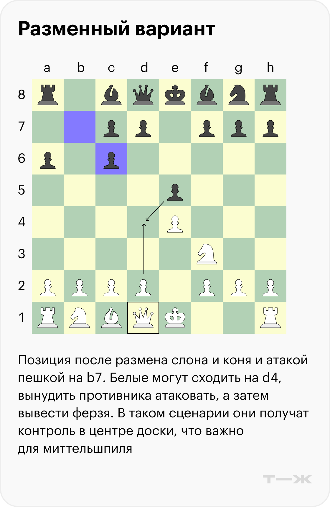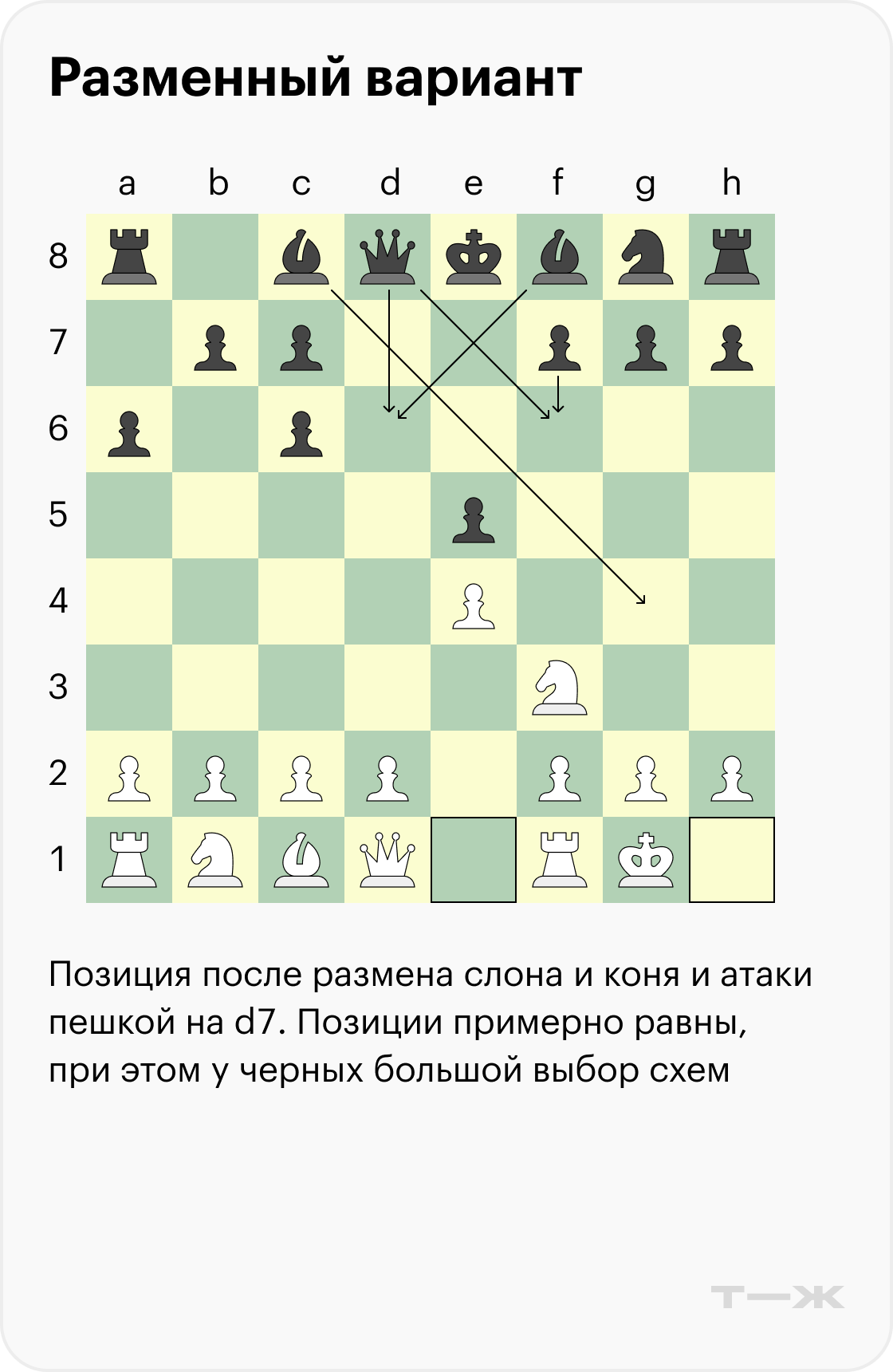 Ниже разберем один разменный вариант со стороны черных, который обязательно нужно знать. Если реагировать на него направшивающимися ходами, они наверняка приведут вас к поражению.