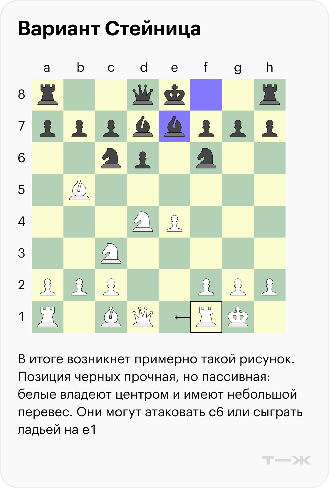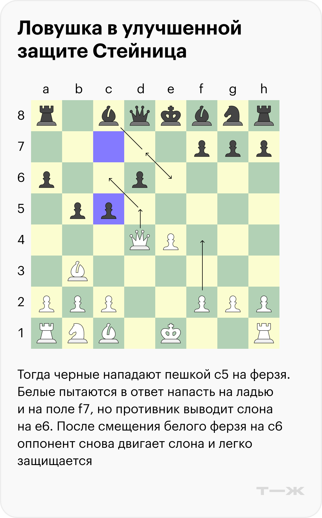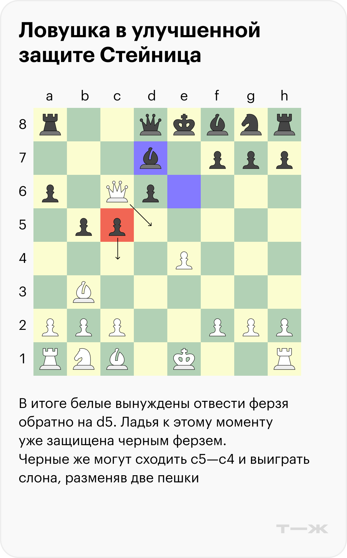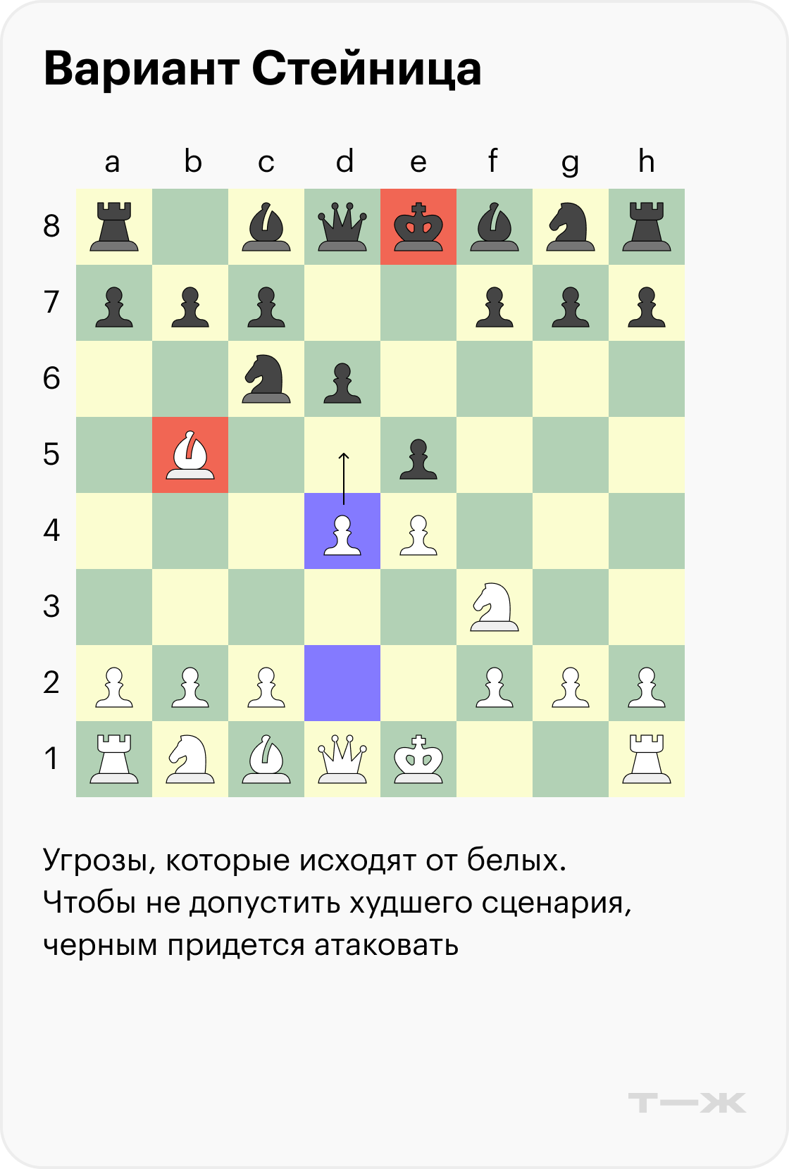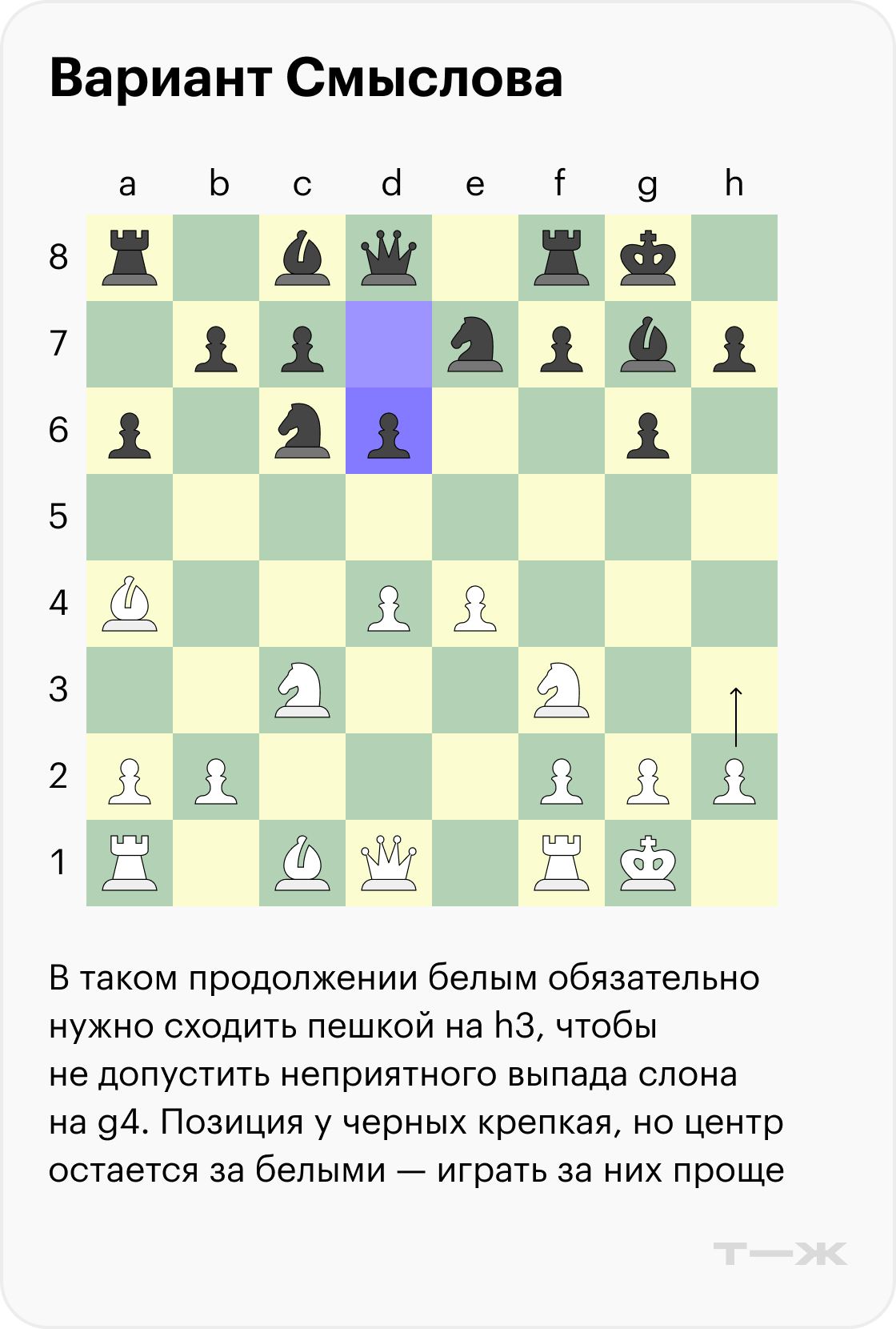 Ниже разберем один разменный вариант со стороны черных, который обязательно нужно знать. Если реагировать на него направшивающимися ходами, они наверняка приведут вас к поражению.