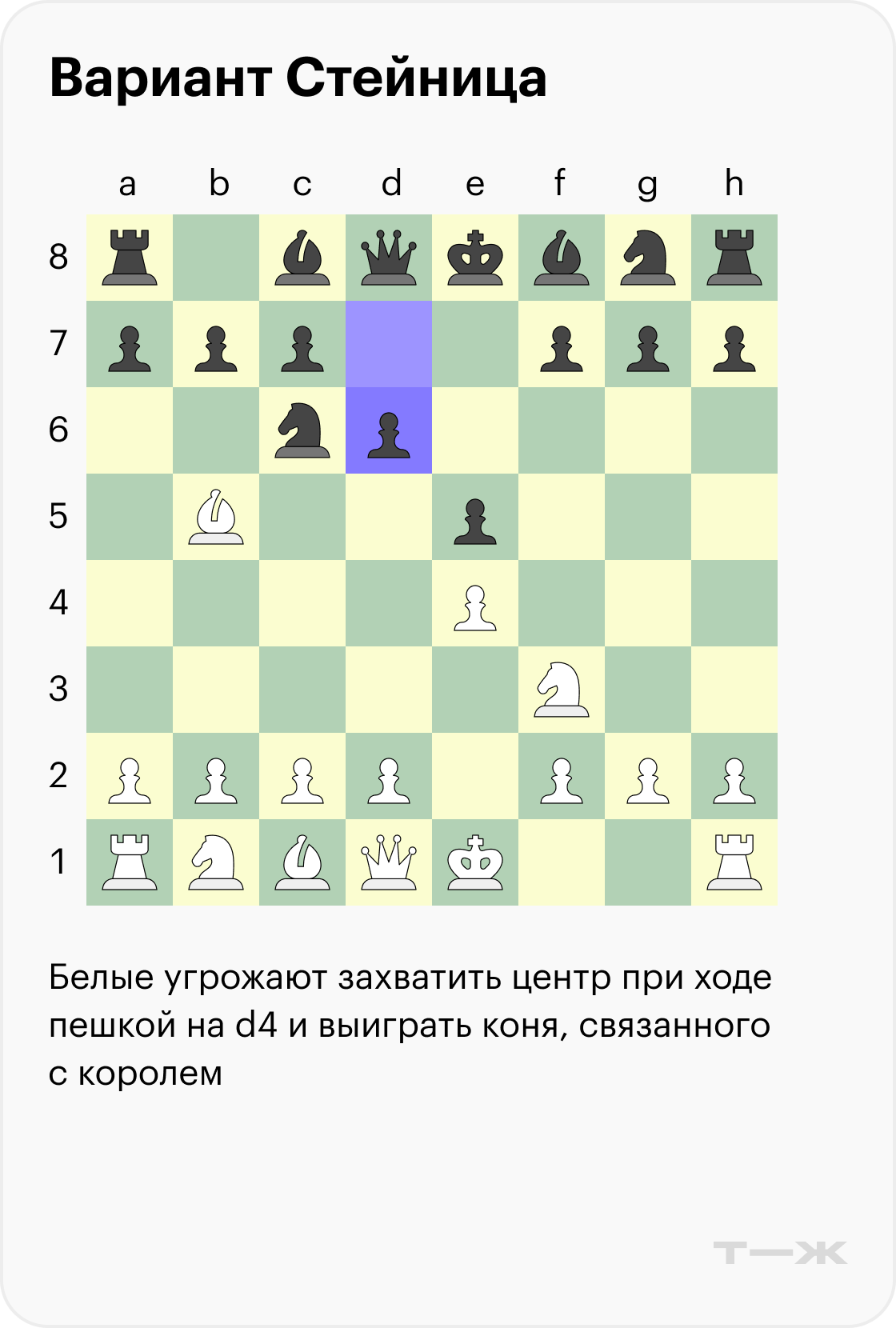 Вариант Стейница (3…d6). Черные ходят на d6, защищая пешку и укрепляя центр. Но из-за этого хода конь на c6 оказывается связанным с королем — у белых возникает больше вариативности.