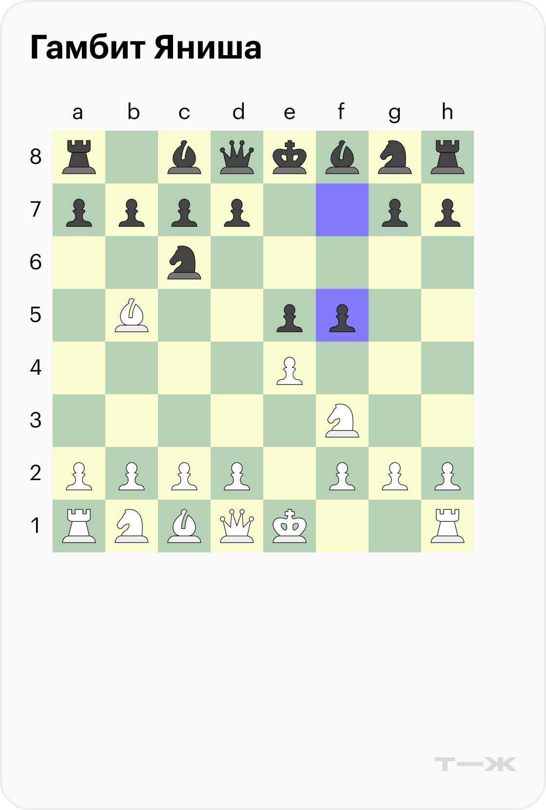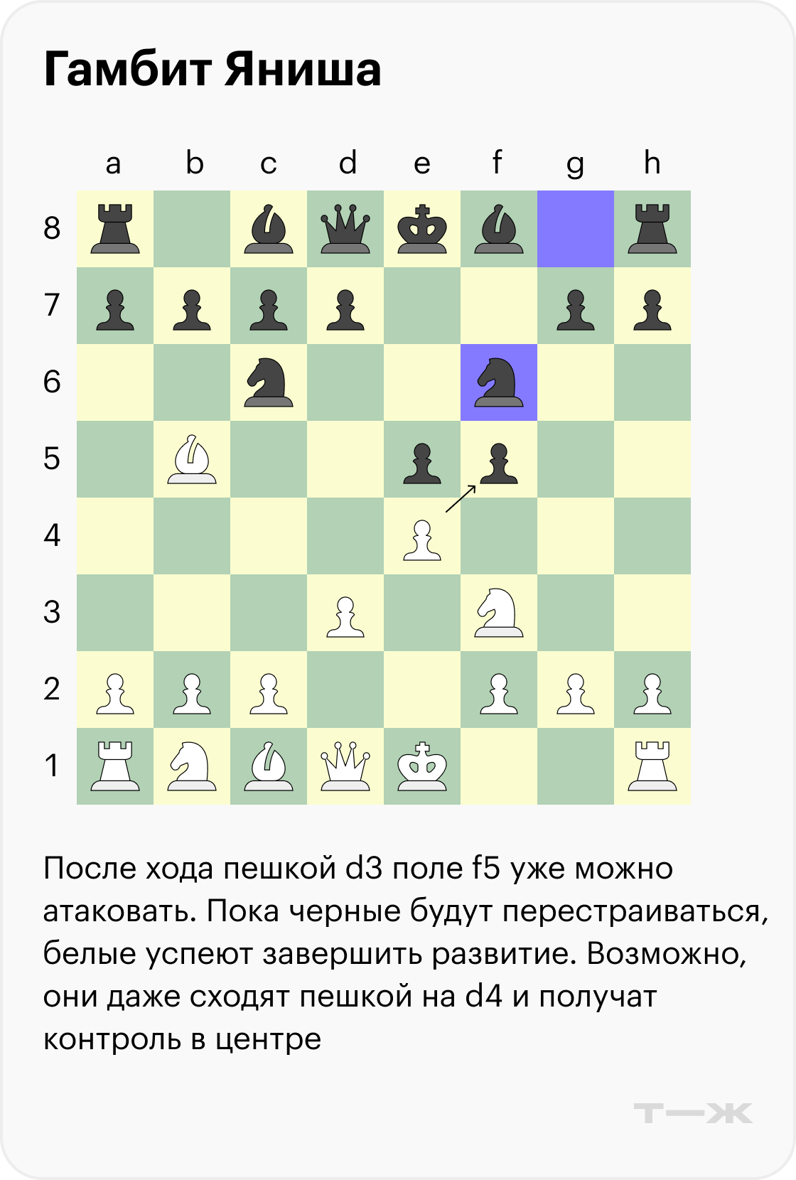 Гамбит Яниша (3…f5). Удивительно, но рискованный ход пешкой от короля — один из самых популярных вариантов среди профессионалов. Подобное развитие встречалось, например, на турнире претендентов 2024 года, причем партия закончилась победой черных.