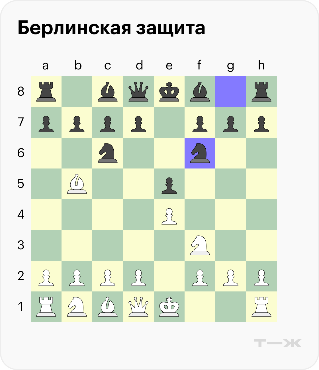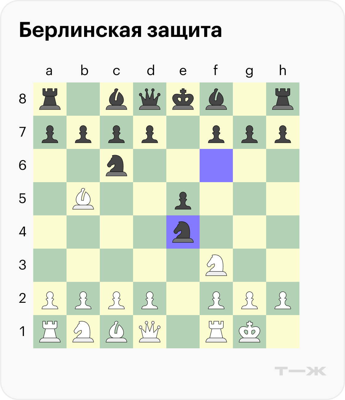 Берлинская защита (3…Nf6). Этот вариант ненадолго терял популярность, но после победы Владимира Крамника в чемпионском матче 2000 года берлинская защита стала одним из основных вариантов дебюта. Чтобы подробно разобрать теорию, не хватит и десятка статей, поэтому ограничимся основными схемами и идеями.