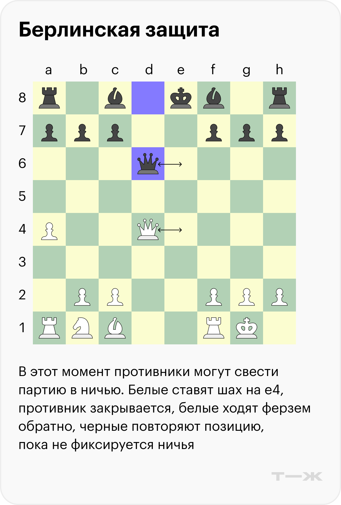 Есть и другой вариант этого развития — без размена ферзей. Он часто используется соперниками, чтобы сделать гроссмейстерскую ничью — когда оба противника изначально на нее согласны.