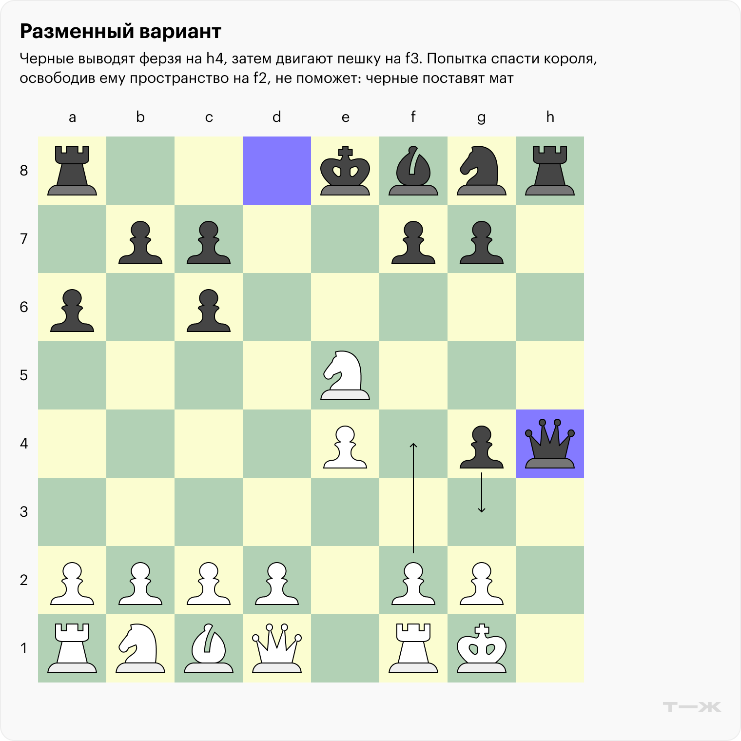 Если белые не будут отводить коня, у черных комфортный перевес за счет владения линией h, но почему бы не забрать пешку на e5? Оказывается, после выпада ферзем на h4 белые получают мат в четыре хода!