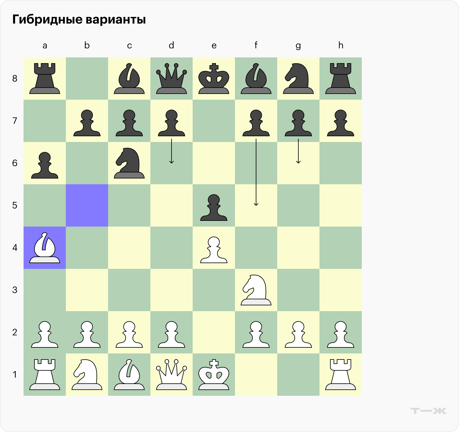 Гибридные варианты и улучшенная защита Стейница. Как и в случае с берлинским эндшпилем, охватить все гибридные позиции сложно, поэтому ограничимся основными. После ходов пешками на g6, f5 или d6 мы получим модификации уже рассмотренных вариантов.