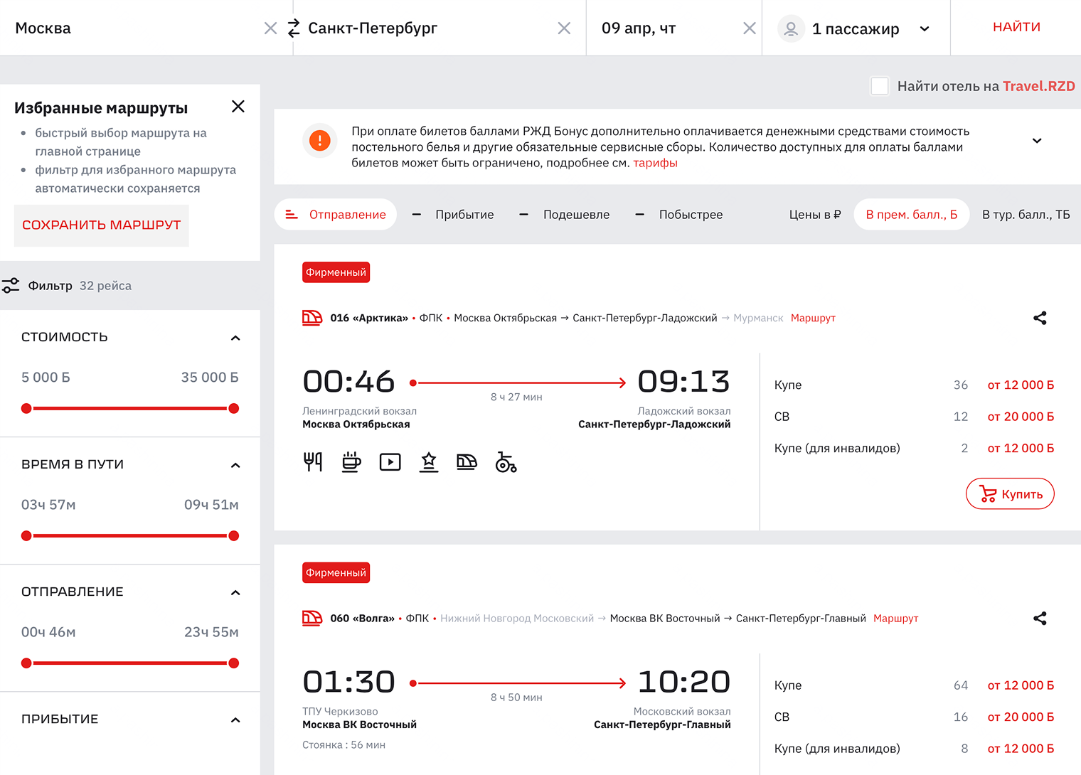 Бонусный билет стоит 12 000 баллов в купе обычного или двухэтажного поезда. Место в «Сапсане» — от 9 500 баллов, в «Ласточке» — от 5 000 баллов. Получается, что за баллы удобно выбирать «Сапсан»: дешевле купе, а времени на дорогу меньше всего.