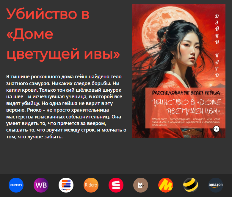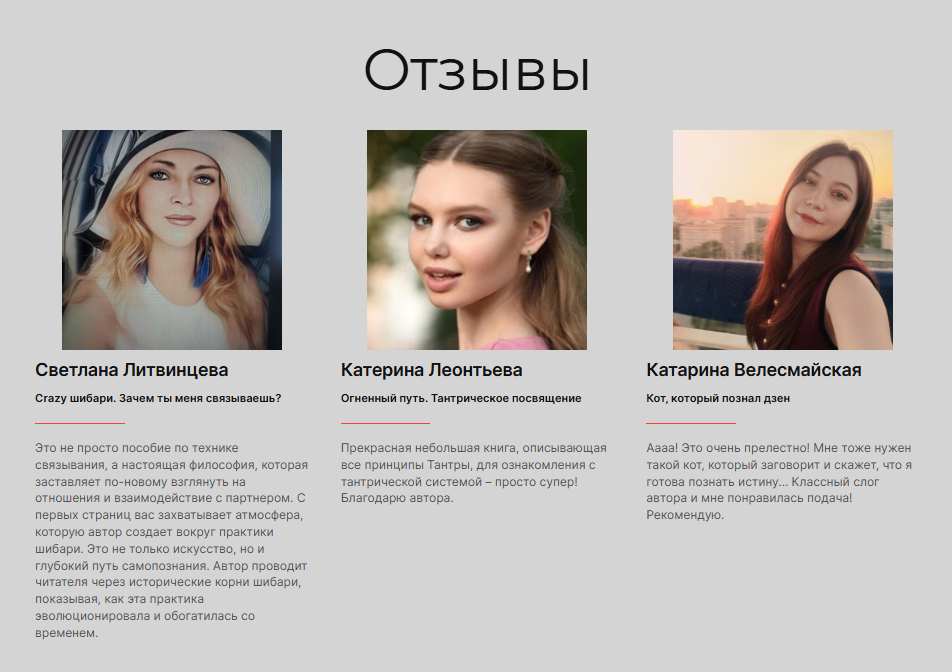 Еще один важный раздел — «Отзывы». Я не думаю, что их должно быть много, чтобы не перегружать сайт. Достаточно привести несколько примеров, подтверждающих, что покупатели остались довольны приобретенными книгами. Разумеется, должен быть раздел «Об авторе», представляющий читателю кто вы, а также перечень ваших доступных контактов для связи и соцсетей. Впоследствии у меня появился еще раздел «Мерч» и туристическая партнерка по путешествиям в Японию (эта страна — основная тема моих книг). Но это уже тема для отдельного разговора.