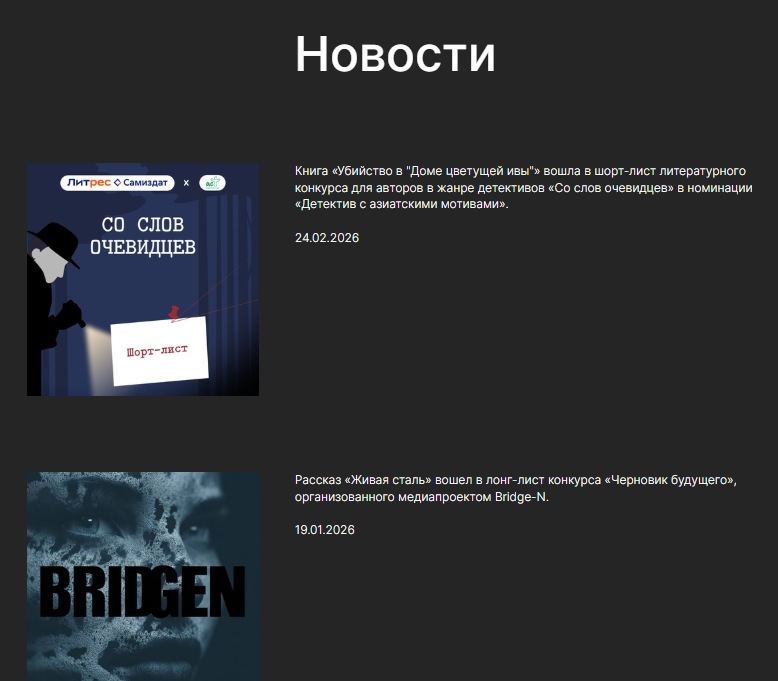 Какую информацию я счел необходимым разместить? Прежде всего, это, конечно, полный список моих книг со ссылками на все магазины, где их можно купить. Также был создан раздел «Новости». Туда я помешаю информацию о своих достижениях в различных конкурсах и вхождениях в топы. Такой раздел я считаю крайне важным, потому что читатель должен видеть, что автор является постоянным активным участником книжной жизни, и его по достоинству оценивают профессионалы.