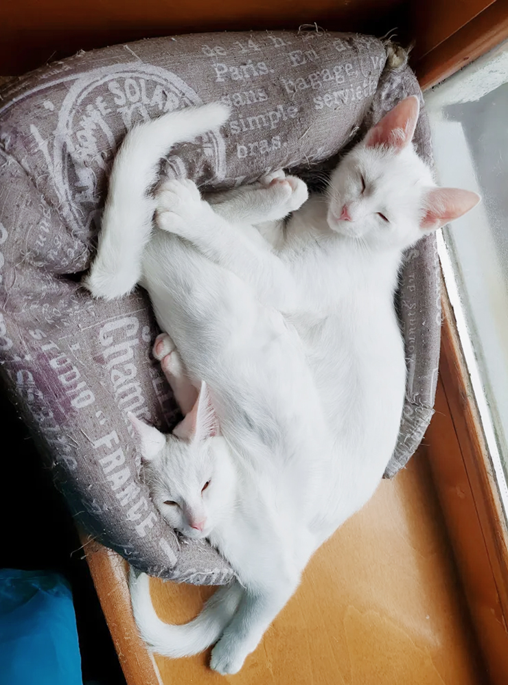 В июле 2025 года я услышала писк через открытое окно. Увидела двух белых котят без мамы, бегающих в траве на склоне у соседнего дома. Я твердо решила, что котят домой не потащу: сняла их на видео и отправила сердобольной соседке Надежде, с которой мы и раньше пристраивали животных.