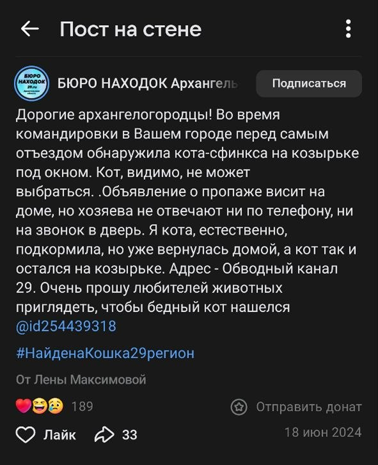 Не рекомендую указывать точное местоположение животного, чтобы его не нашли живодеры. Еще к посту нужно приложить реальную фотографию кошки.