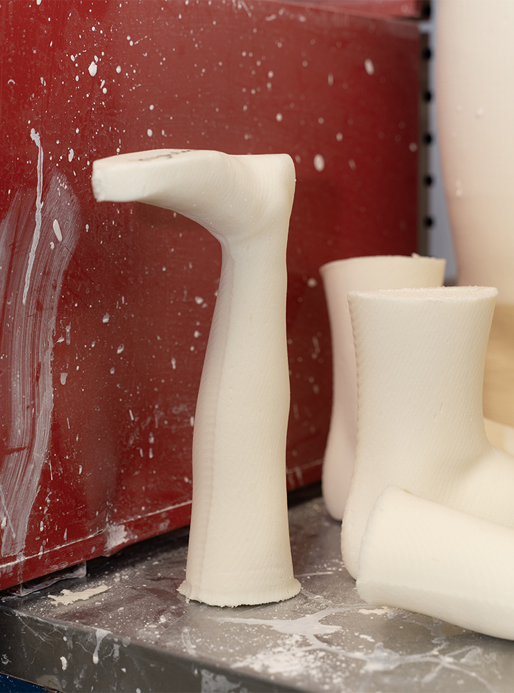 Чтобы изготовить протез, сначала снимаем слепок гипсовым бинтом или делаем 3D-сканирование. Внутрь слепка заливаем жидкий гипс и получаем гипсовую форму культи. Шлифуем и обтягиваем пластиком — получилась тестовая гильза, она нужна для примерки. Это та самая часть, где размещается культя. Человеку должно быть в ней удобно.
